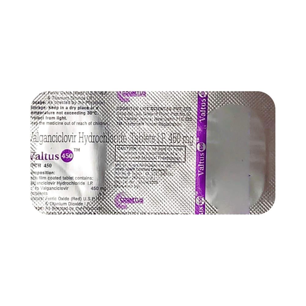 Valtus 450 Tablet is used to treat cytomegalovirus (CMV) infection of the retina (retinitis) in adult patients with acquired immunodeficiency syndrome (AIDS). It is also used for the prevention of CMV infection in patients who have received an organ transplant from a CMV-infected donor. Valtus 450 Tablet should be taken in the dose and duration as advised by your doctor. Do not skip any doses and finish the full course of treatment even if you feel better. It should be taken with food. You should drink plenty of water while on treatment with this medicine, as it helps prevent dehydration and kidney damage.Valtus 450 Tablet may cause a few common side effects like diarrhea, vomiting, anemia, low white blood cells, low platelet levels, insomnia, and vomiting. Inform your doctor if these side effects persist for a longer duration.Before you start Valtus 450 Tablet, let your doctor know if you have any medical conditions. Let your doctor also know about all the medications you are taking, as some medicines may interact with Valtus 450 Tablet. Please consult your doctor if you are pregnant, planning to conceive, or breastfeeding.