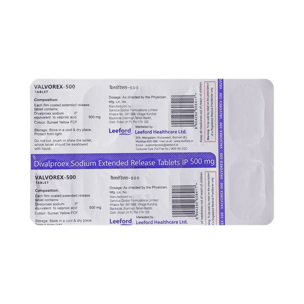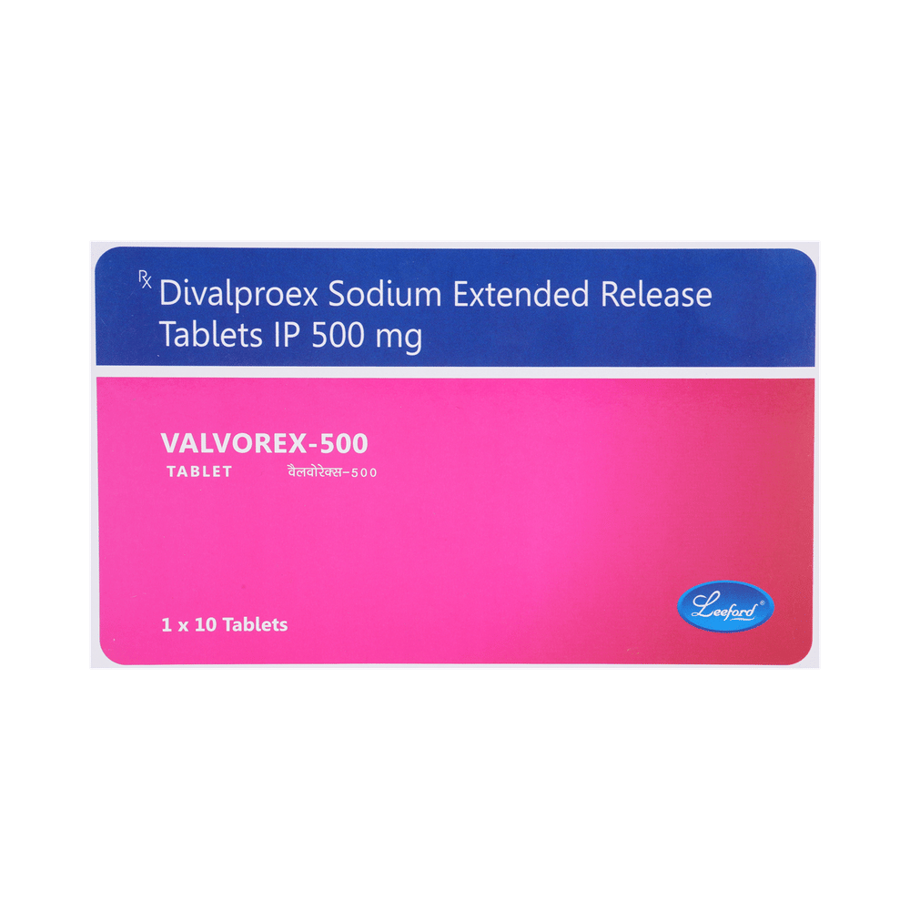 Valvorex 500mg Tablet is a medication used to treat epilepsy, seizures, bipolar disorder, mania, trigeminal neuralgia, and migraines. It works by stabilizing brain activity. Always use it under medical supervision for safe and effective treatment. Valvorex 500mg Tablet may be used alone or in combination with other medicines. Your doctor will determine the appropriate dose and frequency to effectively control your symptoms. You can take this medicine with or without food, but for the best results, take it at the same time each day. It usually takes a couple of weeks to work. It is important to take this medicine regularly and for as long as you are advised, even if you feel well. Missing doses may trigger seizures, and if you stop, your condition may get worse. It should never be stopped suddenly.The most common side effects of Valvorex 500mg Tablet include headache, constipation, nausea, vomiting, dizziness, weight gain, rash, back pain, and abdominal pain. Most of these are not serious. Continue taking the medicine, but consult your doctor if these side effects persist or become bothersome. However, if you notice a skin rash or redness, tell your doctor straight away. Long-term treatment with this medicine can cause osteoporosis (reduced bone mass) and increase your risk of breaking a bone. Also, Valvorex 500mg Tablet may rarely lead to suicidal thoughts and behaviors. If your mood becomes depressed, tell your doctor.Valvorex 500mg Tablet may not be suitable for everybody. Before using it, tell your doctor if you have ever had heart problems, kidney or liver disease, difficulty urinating, depression, or suicidal thoughts. Some medicines can interfere with it and should not be taken together, so tell your doctor about all the medicines you are taking to make sure it is safe for you. If you are pregnant, do not take this medicine without asking your doctor. Avoid drinking alcohol, as it may enhance certain side effects and increase the risk of seizures. You may need frequent blood tests to help your doctor make sure you are taking the right dose both before you start and while you are using it.