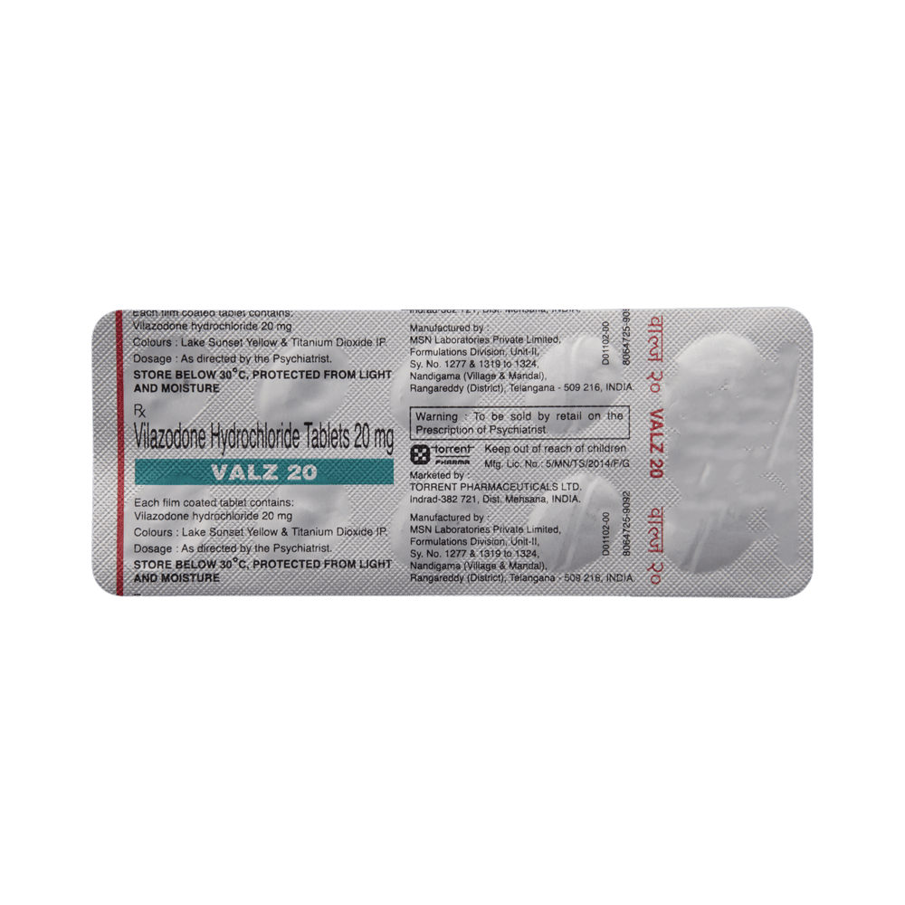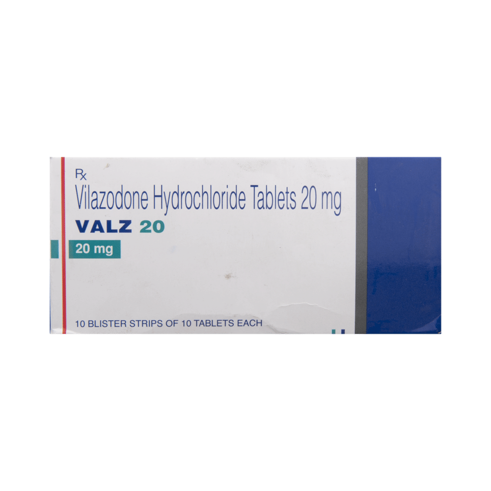 Valz 20 Tablet is used in the treatment of depression. This medicine helps by increasing the level of chemical messengers in the brain that relax the nerves and have a calming effect on the brain. Valz 20 Tablet should be taken with food. It is advised to take this medicine at a fixed time each day. You should never skip any doses and finish the full course of treatment even if you feel better. This medication mustn't be stopped suddenly as it may worsen your symptoms.Some common side effects of this medicine include nausea, vomiting, insomnia (difficulty sleeping), and diarrhea. It even causes dizziness and sleepiness, so do not drive or do anything that requires mental focus. Moreover, most of the side effects are immediate and often go away with time. Please consult your doctor if these bother you or do not go away.Before taking Valz 20 Tablet, inform your doctor if you have any problems with your kidneys, heart, or liver problems or have a history of seizures (epilepsy or fits). Inform your doctor if you develop any unusual changes in mood or behavior, new or worsening depression, or if you have any suicidal thoughts.