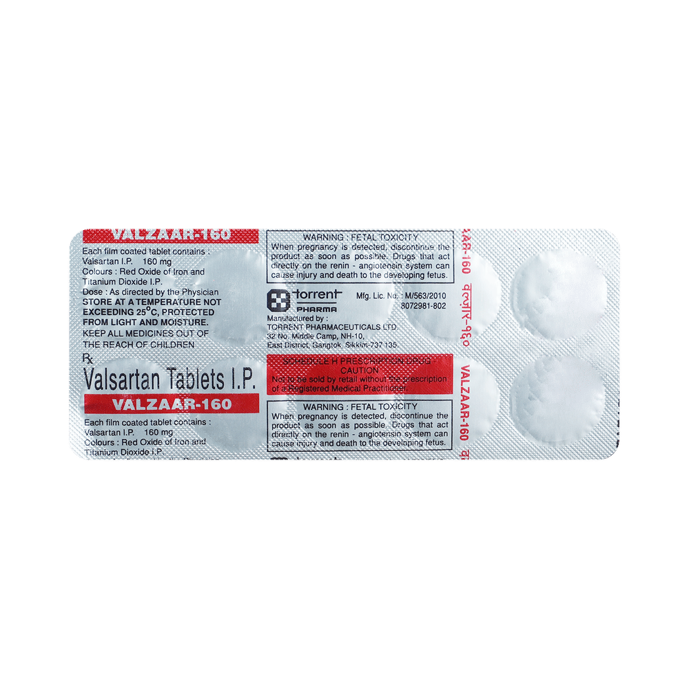 ValzAAR 160 Tablet is used to treat high blood pressure and heart failure. Lowering blood pressure helps to prevent future heart attacks and stroke. This medicine is also effective in preserving kidney function in patients with diabetes. ValzAAR 160 Tablet can be prescribed either alone or in combination with other medicines. It may be taken with or without food during the day or at night. However, try to take it at the same time each day to get the most benefit. It is important to continue taking it regularly even if you feel well or if your blood pressure is controlled. Most people with high blood pressure do not feel ill, but if you stop taking this medicine, your condition could get worse. This is a widely used medicine and is considered safe for long-term use.Making some changes in your lifestyle will also help lower your blood pressure. These may include regular exercise, losing weight, smoking cessation, reducing alcohol intake, and reducing the amount of salt in your diet as advised by your doctor. This medicine is tolerated well by most patients and has few side effects. Dizziness, particularly after the first dose, is known to occur in some people. This may be associated with low blood pressure, orthostatic hypotension, and rash. Let your doctor know if these side effects bother you or do not go away. No weight gain has been seen with the regular use of this medicine.Before taking this medicine, let your doctor know if you have any kidney or liver problems. Pregnant or breastfeeding mothers should also consult their doctor before taking it. Your doctor may check your kidney function, blood pressure and potassium levels in your blood at regular intervals while you are taking this medicine.