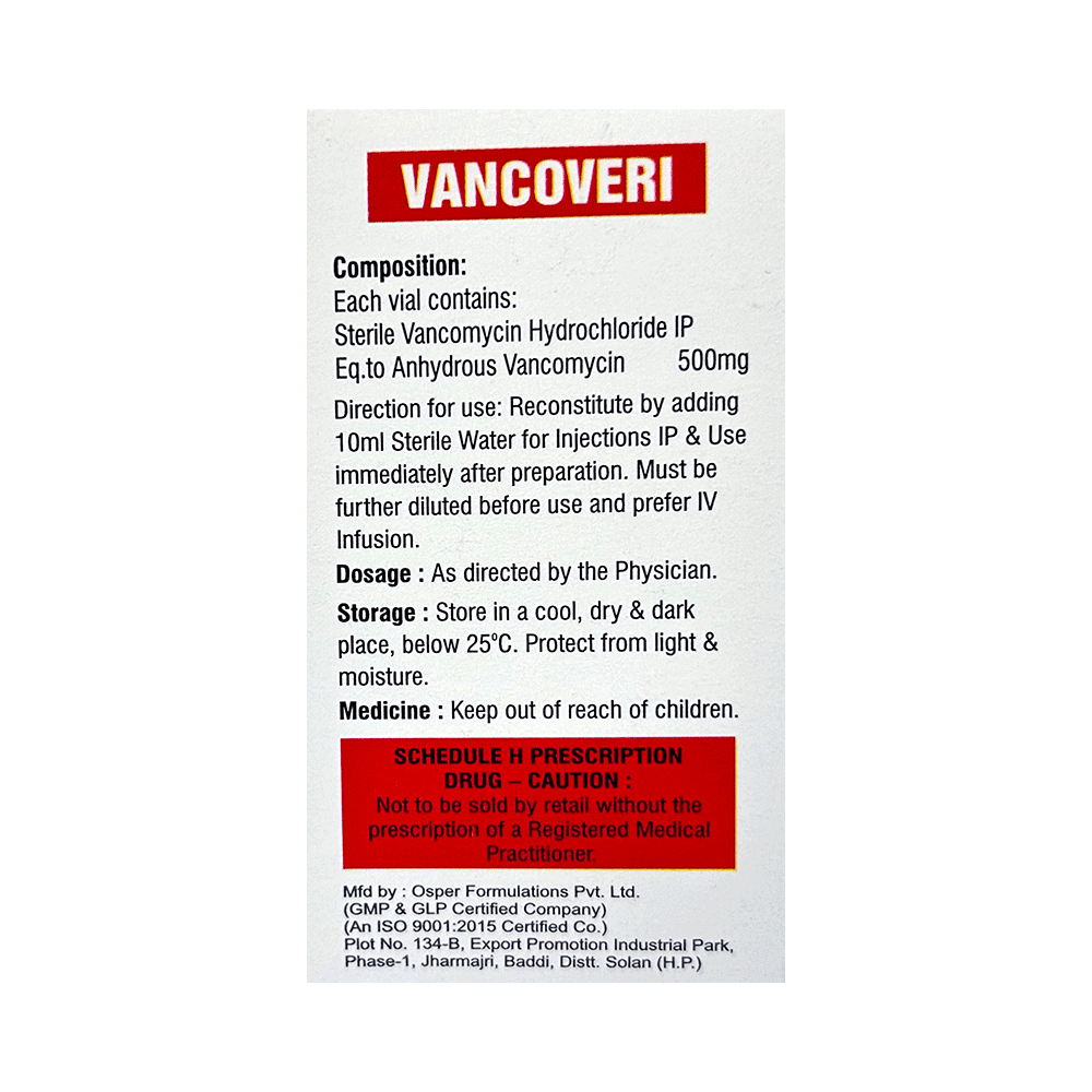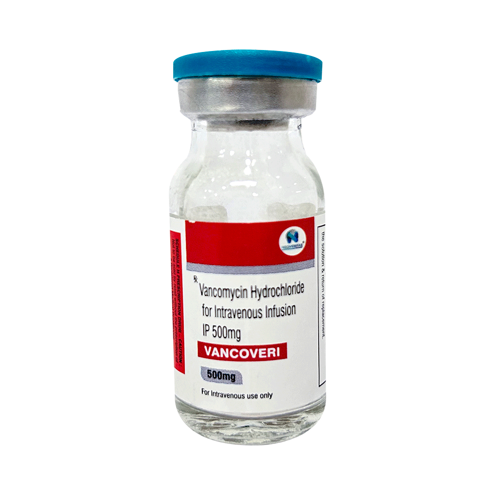 Vancoveri 500mg Infusion is an antibiotic used in the treatment of severe bacterial infections in hospitalized patients. It is effective against infections of the respiratory tract (e.g. pneumonia), urinary tract, skin and soft tissues, bones and joints, heart, blood, and others. Vancoveri 500mg Infusion is also used for the prevention of infection in some high-risk patients undergoing surgical procedures. It works by stopping the growth of bacteria and is useful for treating adults as well as children. It is a narrow-spectrum antibiotic that only covers the gram-positive type of bacteria. This medicine is administered slowly by a drip (infusion) into a vein, under the supervision of a healthcare professional. A rapid infusion can lead to reactions such as low blood pressure, wheezing, shortness of breath, or itching. It may also be combined with other antibiotics to treat additional types of bacteria.Some people may develop local injection site reactions like pain, swelling, and redness. However, these are usually minor and temporary. Other side effects like wheezing, kidney (renal) injury, shortness of breath, flushing (sense of warmth in the face, ears, neck, and trunk) and decreased blood pressure may be seen occasionally.Inform your doctor if you have a history of an allergic reaction to this medication in the past. Your doctor may regularly monitor your kidney function and your hearing while you are taking this medicine. Some people may be advised blood tests to check the level of this medicine in their blood. Consult your doctor if you are pregnant or breastfeeding before taking this medicine.