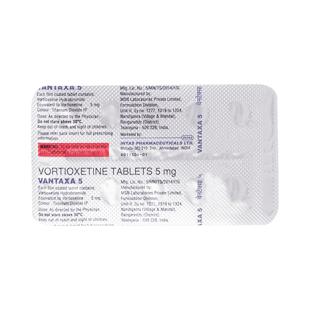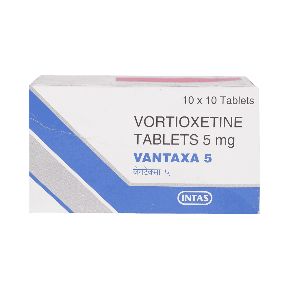 Vantaxa 5mg Tablet is a medicine prescribed to treat depression in adults. It belongs to a group of antidepressants known as serotonin modulator and stimulator (SMS). This medication helps to improve mood and energy levels, and reduce sadness and feelings of worthlessness in people with depression. Vantaxa 5mg Tablet may be taken with or without food but take it at the same time each day to get the most benefit. The dose and how often you need it will be decided by your doctor so that you get the right amount to control your symptoms. It may be increased gradually. If you have trouble sleeping it may be best to take this medicine in the morning. It may take a few weeks before you start to feel better. Do not change the dose or stop taking it without talking to your doctor, even if you feel well. Your condition may get worse or you may suffer unpleasant withdrawal symptoms. Let your doctor know if you do not see any improvement after four weeks.Some common side effects of this medicine include vomiting, nausea, and constipation. Keep taking the medicine but talk to a doctor if these side effects bother you. There may be ways of preventing or reducing them. You should avoid driving or operating machinery until you know how this medicine affects you.Before taking it, you should tell your doctor if you have epilepsy, diabetes, liver or kidney disease, heart problems, glaucoma, drug addiction or bipolar disorder. These may affect your treatment. Pregnant or breastfeeding women should also consult their doctor before taking it. Some other medicines may affect the way it works, especially other antidepressants and medicines called MAO inhibitors. Please tell your doctor about all the medicines you are taking to make sure you are safe.