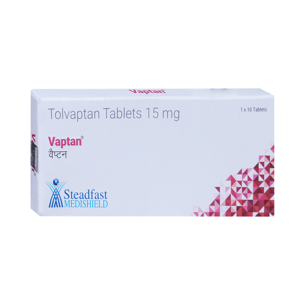 Vaptan Tablet is a medicine used in the treatment of low levels of sodium in the blood. It treats low levels of sodium in the blood, which can result from conditions such as heart failure, cirrhosis, and syndrome of inappropriate antidiuretic hormone (SIADH). Vaptan Tablet can be taken with or without food. It should be taken exactly as prescribed by your doctor. Your doctor will decide the dose and how often you should take them. You should take this medicine regularly to get the most benefit from it. Do not stop taking the medicine even if you feel better unless the doctor tells you so.Using this medicine may cause few common side effects such as frequent urge to urinate, nocturia (increased urge to urinate during the night), dryness in mouth, increased thirst, nausea, increased blood creatinine, hyperkalemia, and constipation. Let your doctor know if any of these side effects do not go away with time or get worse. Before using this medicine, inform your doctor if you have any problems with your kidneys or liver. While on this medicine, your doctor will closely monitor the sodium levels in your blood. You should also tell your doctor all the other medications you are taking.