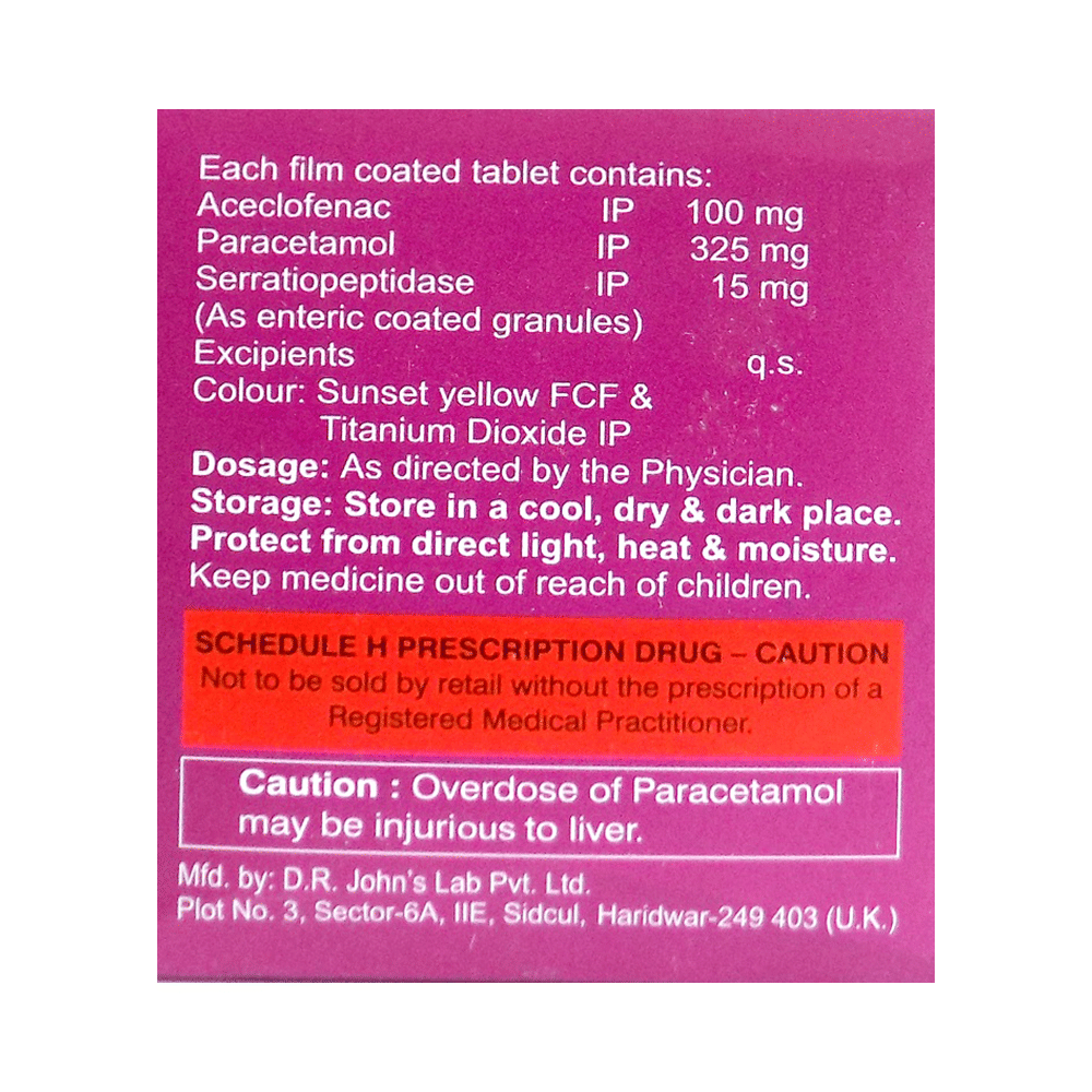 Salt Composition: Aceclofenac (100mg) + Paracetamol (325mg) + Serratiopeptidase (15mg)