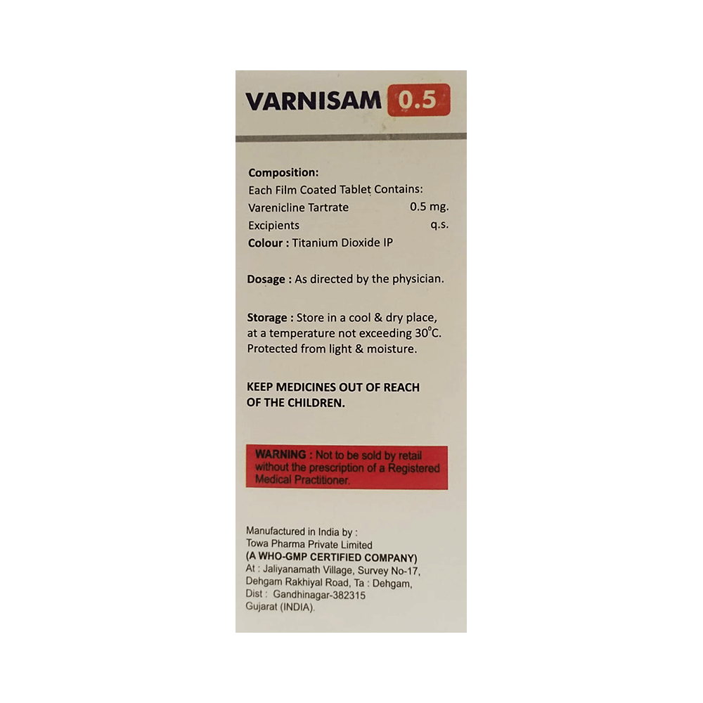 Varnisam 0.5 Tablet helps quit smoking by reducing the craving for a cigarette and the irritable feeling that occurs when you stop smoking. It works by blocking the nicotine effect on the brain and this suppresses enjoyment while smoking or the urge to smoke. Varnisam 0.5 Tablet may be taken with or without food, preferably at the same time each day. Take it in the dose and duration as advised by your doctor. If you have missed a dose, take it as soon as you remember. Do not skip any doses and finish the full course of treatment. You should never stop this medicine suddenly without talking to your doctor. This medication mustn't be stopped suddenly without talking to your doctor.Some common side effects of using this medication are nausea, headache, insomnia (difficulty sleeping), abnormal dreams, and nasopharyngitis (inflammation of the throat and nasal passages). Initially, it may also cause dizziness and sleepiness, so do not drive or do anything that requires mental focus until you know how this medicine affects you.Before taking Varnisam 0.5 Tablet, inform your doctor if you have a history of heart diseases, fits (seizures), or other mental disorders. Remember it will take time, support, willpower, and determination to quit the habit of smoking. It should be used as a smoking cessation aid along with programs including education, counseling, and support. Quitting smoking reduces the risk of developing further health-related problems such as heart or lung diseases as well as certain types of cancer.