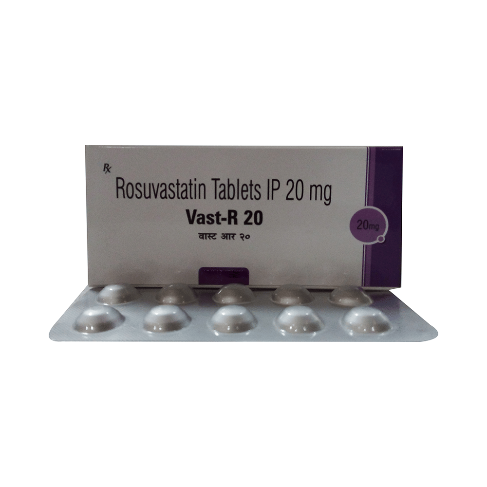 Vast-R 20 Tablet belongs to a group of medicines called statins. It is used to lower cholesterol and triglyceride levels and reduce the risk of heart disease. Cholesterol is a fatty substance that builds up in your blood vessels and causes narrowing, which may lead to a heart attack or stroke. Vast-R 20 Tablet is a widely prescribed medicine and is regarded as safe for long-term use. It can be taken with a meal or on an empty stomach. You can take it at any time of the day, but try to take it at the same time each day. Most people with high cholesterol do not feel ill. However, stopping your medicine may increase your cholesterol levels, making your condition worse and increasing your risk of heart disease and stroke.It is important to have your cholesterol levels checked regularly. This medicine is only one part of the treatment program, which should also include a healthy diet, regular exercise, smoking cessation, moderation of alcohol intake, and weight reduction. You can eat normally while taking this medicine, but try to avoid foods that are high in fat.Common side effects of this medicine include muscle pain, weakness, nausea, headache, and abdominal pain. These are usually mild and disappear after a short time. Consult your doctor if they persist or if you notice any yellowing of your eyes or get repeated or unexplained muscle pains.This medicine should not be used in conditions such as liver disease. Also, pregnant women and breastfeeding women should not take this medicine, as it may harm the developing baby. Diabetic patients should monitor their blood sugar levels while taking this medicine, as it may lead to an increase in blood sugar levels.