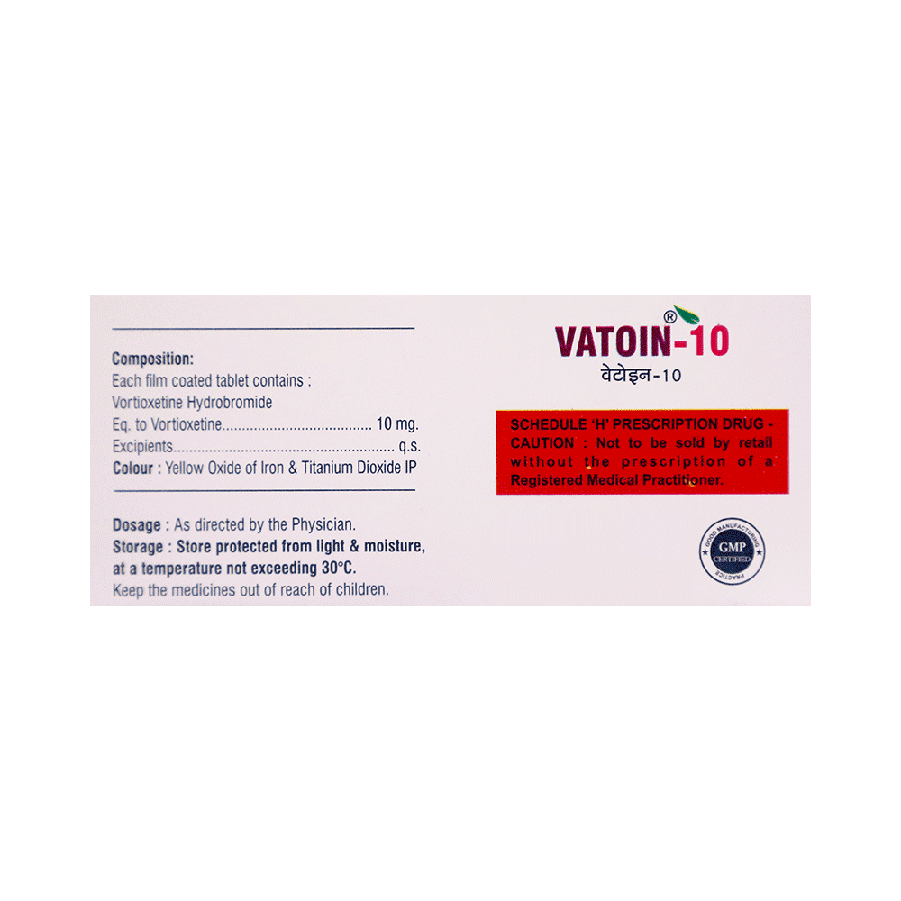 Vatoin 10 Tablet is a medicine prescribed to treat depression in adults. It belongs to a group of antidepressants known as serotonin modulator and stimulator (SMS). This medication helps to improve mood and energy levels, and reduce sadness and feelings of worthlessness in people with depression. Vatoin 10 Tablet may be taken with or without food but take it at the same time each day to get the most benefit. The dose and how often you need it will be decided by your doctor so that you get the right amount to control your symptoms. It may be increased gradually. If you have trouble sleeping it may be best to take this medicine in the morning. It may take a few weeks before you start to feel better. Do not change the dose or stop taking it without talking to your doctor, even if you feel well. Your condition may get worse or you may suffer unpleasant withdrawal symptoms. Let your doctor know if you do not see any improvement after four weeks.Some common side effects of this medicine include vomiting, nausea, and constipation. Keep taking the medicine but talk to a doctor if these side effects bother you. There may be ways of preventing or reducing them. You should avoid driving or operating machinery until you know how this medicine affects you.Before taking it, you should tell your doctor if you have epilepsy, diabetes, liver or kidney disease, heart problems, glaucoma, drug addiction or bipolar disorder. These may affect your treatment. Pregnant or breastfeeding women should also consult their doctor before taking it. Some other medicines may affect the way it works, especially other antidepressants and medicines called MAO inhibitors. Please tell your doctor about all the medicines you are taking to make sure you are safe.