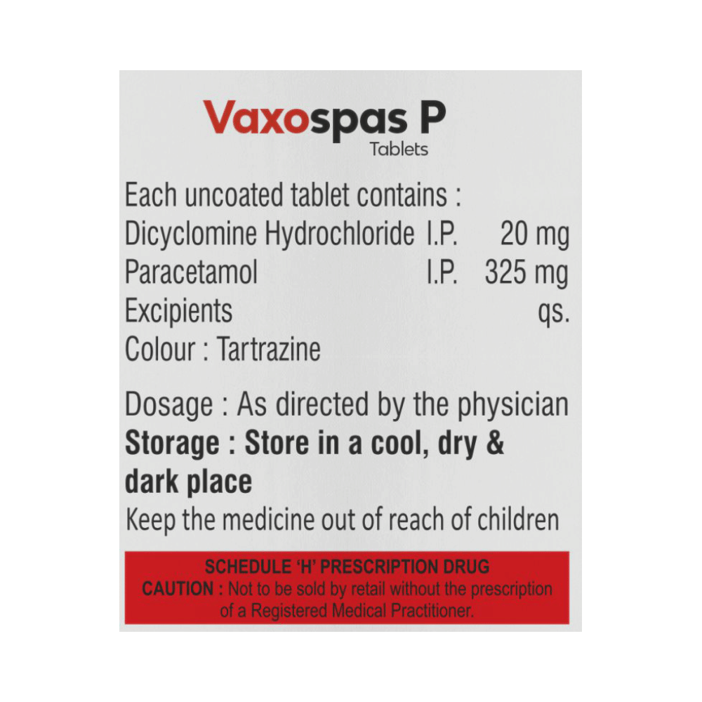 Vaxospas P 20mg/325mg Tablet is a combination of two medicines: dicyclomine and paracetamol, which relieves abdominal pain and cramps. Dicyclomine is an anti-cholinergic which relaxes the muscles in the stomach and gut (intestine). It stops sudden muscle contractions (spasms), thereby relieving cramps, pain, bloating, and discomfort. Paracetamol is an analgesic (pain reliever) which works by blocking the release of certain chemical messengers that cause pain.