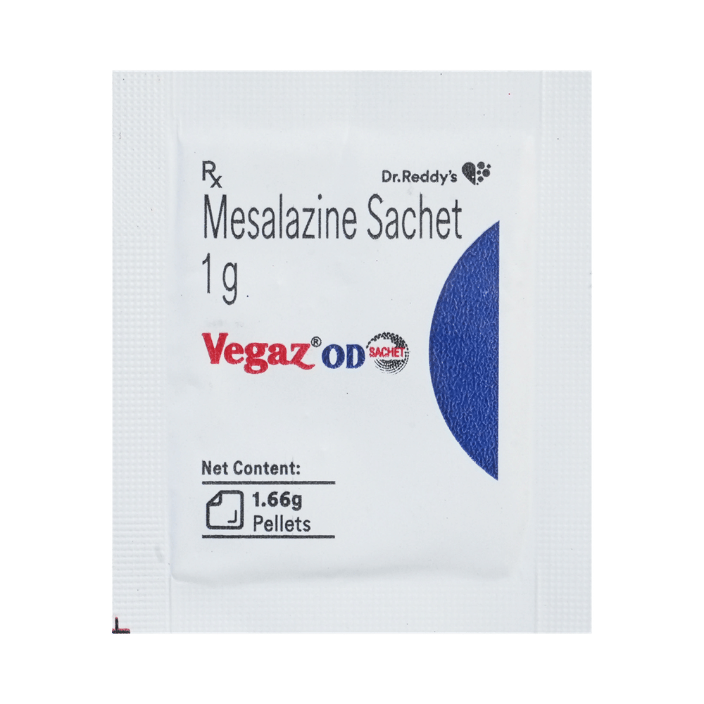 Vegaz OD 1gm Sachet is an anti-inflammatory medicine used to treat a type of bowel disease known as ulcerative colitis. It helps to reduce symptoms such as diarrhea, bleeding and stomach pain by reducing inflammation in the bowel. Vegaz OD 1gm Sachet may also be used to treat another type of bowel disease known as Crohn’s ileocolitis. It should be taken with food. The dose will depend on what you are being treated for but take it exactly as your doctor prescribes. You should keep taking this medicine for as long as your doctor recommends. If you stop treatment too early your symptoms may come back and your condition may worsen.The most common side effects of this medicine include nausea, diarrhea, stomach pain, headache, itching, flatulence, and vomiting. If these symptoms bother you, do not go away, or get worse, let your doctor know. There may be ways of reducing or preventing them. Some people may get a severe allergic reaction that needs urgent medical attention. Contact your doctor immediately if you notice symptoms like swelling of the face, tongue, throat, or lips, unusual bleeding, bruising, rash, fever, sore throat, or excessive tiredness. Before taking it, tell your doctor if you have any kidney or liver problems or a blockage in your stomach. Your age may also be a factor in deciding whether this medicine is suitable. Pregnant or breastfeeding women should also consult their doctor before taking this medicine. Let your doctor know about all other medications you are taking as some may affect, or be affected by this medicine.