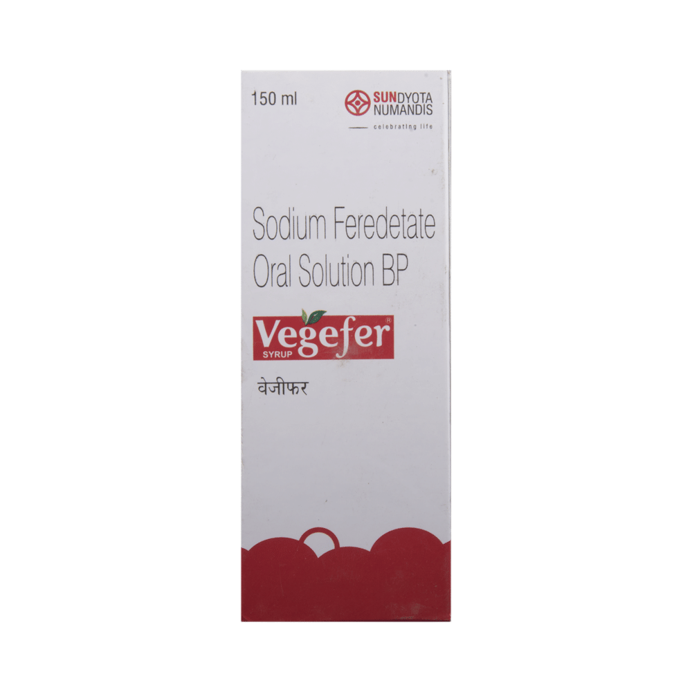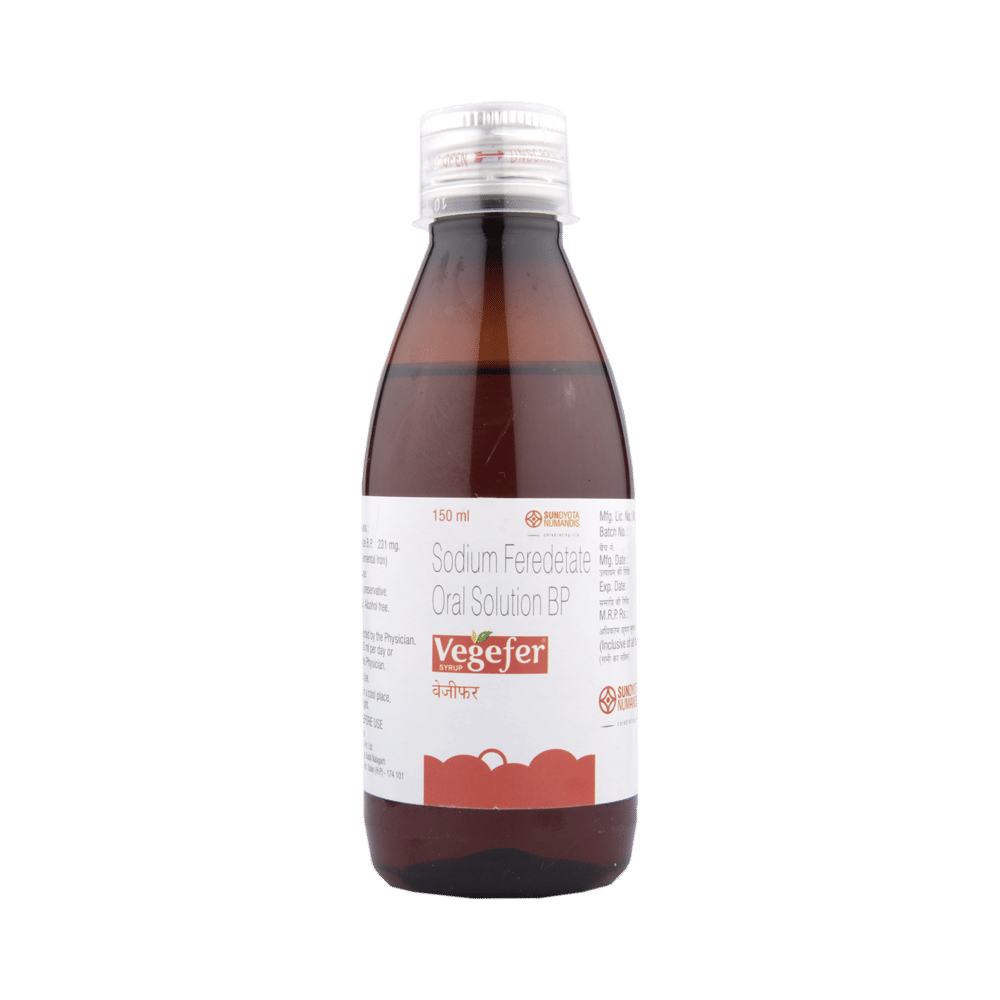 Vegefer Syrup is a medicine that is used to treat or prevent iron deficiency anemia. It works by supplying the body with iron, which is essential for the production of hemoglobin. It restores iron levels and helps improve energy, supports healthy blood function, and reduces symptoms of anemia. Take Vegefer Syrup in the exact dose and duration prescribed by your doctor. It may be taken with or without food. In addition to taking this medicine, include iron-rich foods such as green leafy vegetables, legumes, and fortified cereals in your diet. Avoid tea, coffee, and calcium-rich foods around the time of taking the medicine, as they may reduce iron absorption.Some people may experience side effects like nausea, stomach discomfort, constipation, or a darkening of stools. These are generally mild and temporary. Drinking plenty of water, eating fiber-rich foods, and taking the syrup with food may help ease stomach issues. If side effects persist or become bothersome, talk to your doctor.Before starting Vegefer Syrup, inform your doctor if you have any medical conditions such as liver problems, a history of iron overload, or any gastrointestinal disorders. This syrup should be used with caution in children and only under medical supervision. Do not take other iron supplements or multivitamins containing iron unless recommended by your doctor.