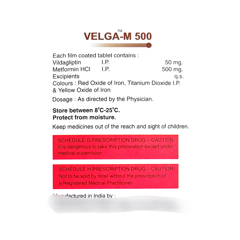 Velga-M 500 Tablet is a combination of two medicines that control high blood sugar levels in people with type 2 diabetes mellitus. This helps prevent serious complications of diabetes, such as kidney damage and blindness, and may also reduce your chances of having a heart attack or stroke. Velga-M 500 Tablet can be prescribed alone or together with other diabetes medications. All diabetes medicines work best when used along with a healthy diet and regular exercise. The dose you are given will depend on your condition, blood sugar levels, and what other medicines you are taking. Taking it with meals helps reduce the chances of developing an upset stomach. You should take it regularly, at the same time each day, to get the most benefit, and you should not stop unless your doctor recommends it. It controls your blood sugar levels and helps prevent serious complications in the future. It is important to stay on the diet and exercise program recommended by your doctor while taking this medicine. Your lifestyle plays a big part in controlling diabetes.The most common side effects of taking this medicine include nausea, headache, and gastroesophageal reflux disease. Low blood sugar level (hypoglycemia) is also a possible side effect if you are also taking other diabetes medicines like insulin or sulfonylurea, so you need to know how to recognize and deal with it.This medicine is not suitable for everyone. Before taking it, you should let your doctor know if you have ever had kidney, liver, or heart disease; problems with your pancreas; or if you drink a lot of alcohol. Pregnant or breastfeeding women should also consult their doctor before taking this medicine. Some other medicines can affect this one, so tell your doctor about all the medicines you are taking to make sure Velga-M 500 Tablet is safe. You should try to avoid drinking alcohol, as it lowers blood glucose. Your doctor will check your kidney function and blood sugar levels before and during treatment.