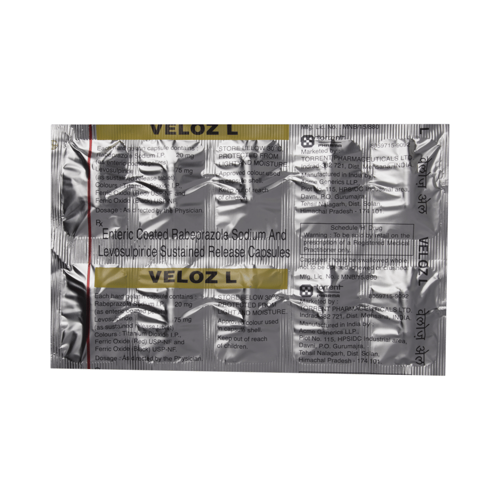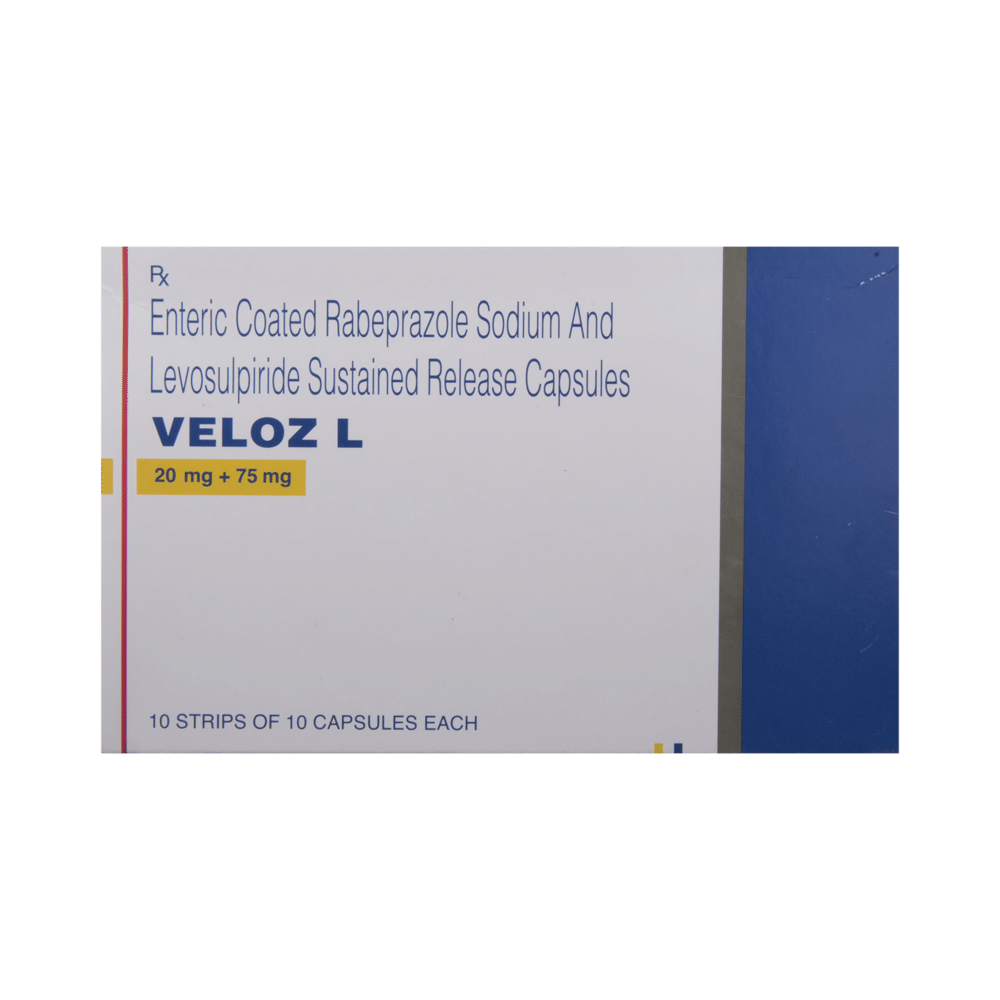 Veloz L Capsule SR is a prescription medicine which is used in the treatment of gastroesophageal reflux disease (acid reflux), intestinal ulcers, and irritable bowel syndrome. It reduces excess acid production in the stomach and prevents the reflux of stomach acid into the food pipe. Veloz L Capsule SR is taken with or without food in a dose and duration as advised by the doctor. The dose you are given will depend on your condition and how you respond to the medicine. You should keep taking this medicine for as long as your doctor recommends. If you stop treatment too early your symptoms may come back and your condition may worsen. Let your healthcare team know about all other medications you are taking as some may affect, or be affected by this medicine.The most common side effects are nausea, stomach pain, diarrhea, flatulence, constipation, headache, weakness, and flu-like symptoms. Most of these are temporary and usually resolve with time. Contact your doctor straight away if you are at all concerned about any of these side effects. It may also cause dizziness and sleepiness, so do not drive or do anything that requires mental focus until you know how this medicine affects you. Avoid drinking alcohol while taking this medicine as it can worsen your sleepiness.Lifestyle modifications like having fiber-rich diet, avoiding foods that trigger your symptoms, increasing fluid intake and regular exercise can help you to get better results. Before taking it, you should tell your doctor if you have any kidney or liver diseases. You should also tell your doctor if you are pregnant, planning pregnancy or breastfeeding.