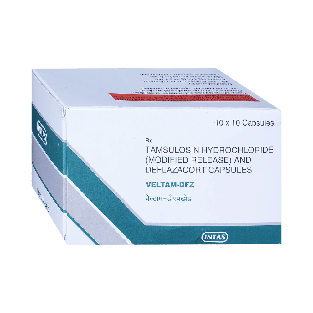 Veltam DFZ 0.4mg/30mg Capsule MR is a combination of two medicines: Tamsulosin and Deflazacort. Tamsulosin is an alpha-blocker. It works by relaxing the muscle around the bladder exit and prostate gland so as to allow easy passage of urine. Deflazacort is a steroid medicine. It works by reducing inflammation (swelling) in the kidneys to promote the passage of the stones through urine.
