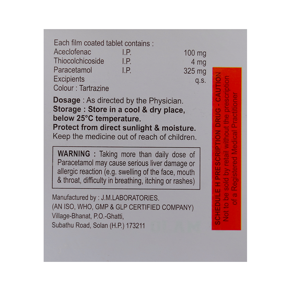 Salt Composition: Thiocolchicoside (4mg) + Aceclofenac (100mg) + Paracetamol (325mg)