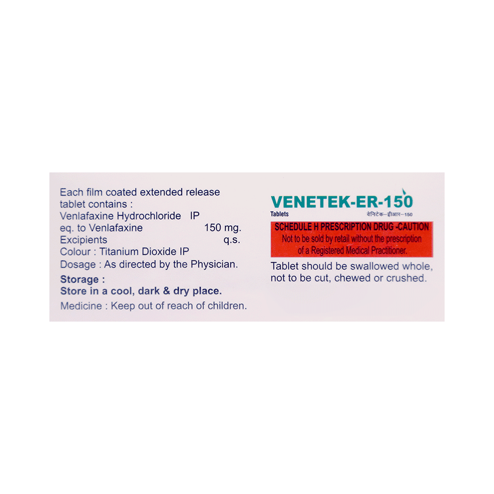 Venetek-ER 150 Tablet is a medicine used to treat major depressive disorder and anxiety disorders. It helps improve mood, reduce nervousness, and improve overall well-being by restoring the balance of certain brain chemicals that affect mood and emotions. Venetek-ER 150 Tablet should be taken with food. Take this medicine at the same time each day to maintain a stable level in your blood. If you miss a dose, take it as soon as you remember. Do not skip doses, and complete the full course of treatment even if you feel better. Do not stop taking this medication abruptly, as it may worsen your symptoms.Some common side effects of this medicine include nausea, insomnia (difficulty sleeping), constipation, increased sweating, and sexual dysfunction. However, these side effects are temporary and typically resolve on their own over time. Consult your doctor if these do not subside or bother you.Venetek-ER 150 Tablet may cause dizziness and drowsiness, so avoid driving or engaging in activities that require mental focus until you understand how this medicine affects you. Before taking Venetek-ER 150 Tablet, inform your doctor if you have any kidney, heart, or liver conditions or a history of seizures (epilepsy or fits). Additionally, notify your doctor if you experience any unusual mood or behavioral changes, worsening depression, or suicidal thoughts. Pregnant and breastfeeding women should consult before taking this medicine, as it may cause harmful effects on the developing baby.