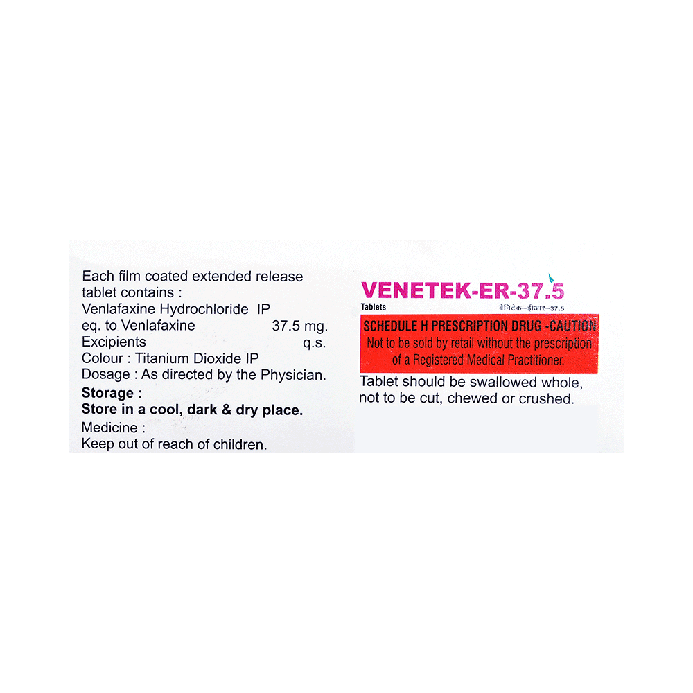 Venetek-ER 37.5 Tablet is a medicine used to treat major depressive disorder and anxiety disorders. It helps improve mood, reduce nervousness, and improve overall well-being by restoring the balance of certain brain chemicals that affect mood and emotions. Venetek-ER 37.5 Tablet should be taken with food. Take this medicine at the same time each day to maintain a stable level in your blood. If you miss a dose, take it as soon as you remember. Do not skip doses, and complete the full course of treatment even if you feel better. Do not stop taking this medication abruptly, as it may worsen your symptoms.Some common side effects of this medicine include nausea, insomnia (difficulty sleeping), constipation, increased sweating, and sexual dysfunction. However, these side effects are temporary and typically resolve on their own over time. Consult your doctor if these do not subside or bother you.Venetek-ER 37.5 Tablet may cause dizziness and drowsiness, so avoid driving or engaging in activities that require mental focus until you understand how this medicine affects you. Before taking Venetek-ER 37.5 Tablet, inform your doctor if you have any kidney, heart, or liver conditions or a history of seizures (epilepsy or fits). Additionally, notify your doctor if you experience any unusual mood or behavioral changes, worsening depression, or suicidal thoughts. Pregnant and breastfeeding women should consult before taking this medicine, as it may cause harmful effects on the developing baby.