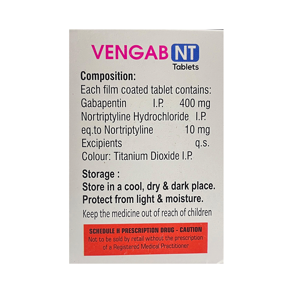 Vengab NT Tablet is a combination medicine used for the treatment of neuropathic pain. This medicine decreases the pain by stopping the movement of pain signals to the brain. Vengab NT Tablet is taken by mouth, with or without food and preferably at night. It is advised to take it at a fixed time each day to maintain a consistent level of medicine in the blood. In case you miss a dose of this medicine, take it as soon as you remember. Finish the full course of treatment even if you feel better. It is important not to stop taking this medicine suddenly without talking to the doctor as it may worsen your symptoms.Some common side effects of this medicine constipation, difficulty in urination, weight gain, tiredness, and dryness in mouth. It may also cause dizziness and sleepiness, so do not drive or do anything that requires mental focus until you know how this medicine affects you. This medicine may cause weight gain and to control it, you should exercise regularly and take a balanced diet. Remember to inform the doctor if you develop any unusual changes in mood as this medicine may lead to suicidal thoughts.Before taking this medicine let your doctor know if you suffer from kidney or liver disease. Your doctor should also know about all other medicines you are taking as many of these may make this medicine less effective or change the way it works. Inform your doctor if you are pregnant, planning pregnancy or breastfeeding.