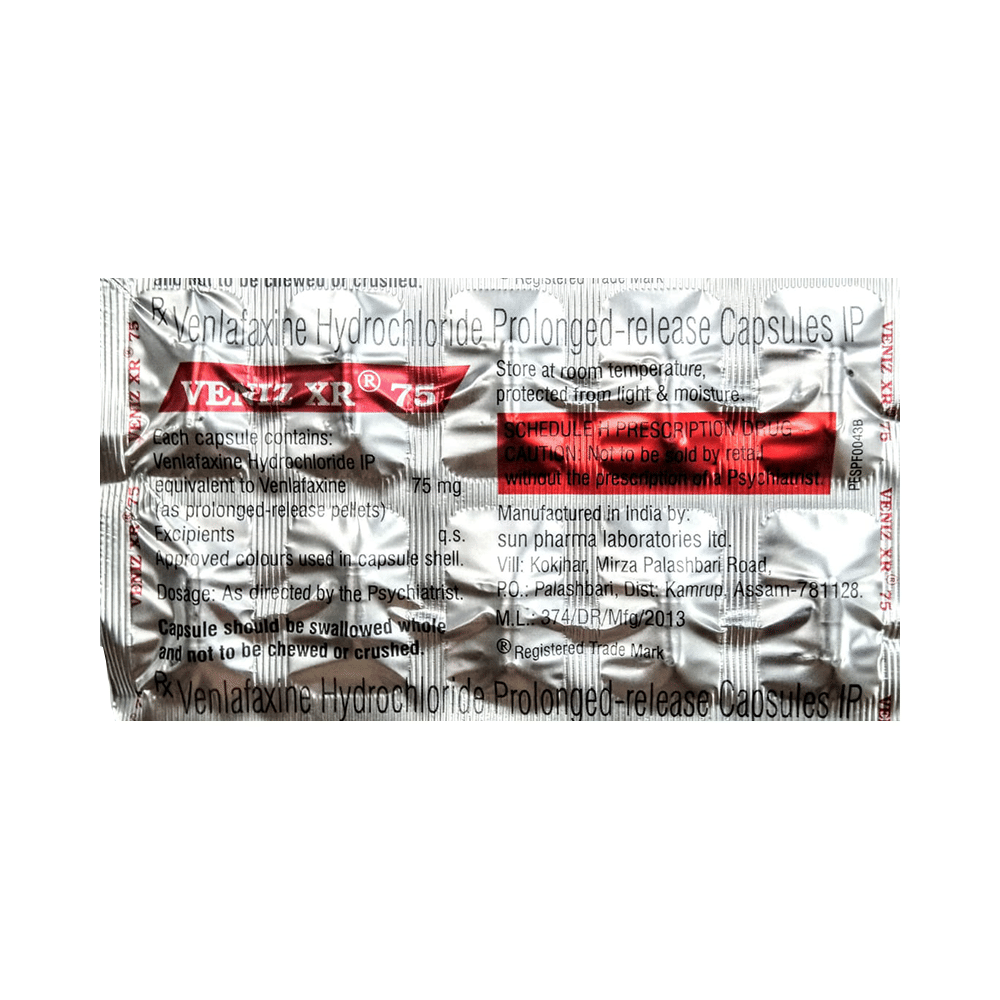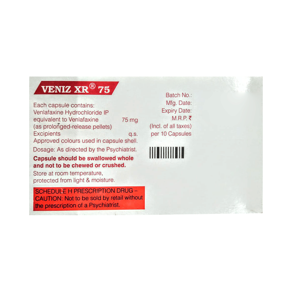 Veniz XR 75 Capsule is a medicine used to treat major depressive disorder and anxiety disorders. It helps improve mood, reduce nervousness, and improve overall well-being by restoring the balance of certain brain chemicals that affect mood and emotions. Veniz XR 75 Capsule should be taken with food. Take this medicine at the same time each day to maintain a stable level in your blood. If you miss a dose, take it as soon as you remember. Do not skip doses, and complete the full course of treatment even if you feel better. Do not stop taking this medication abruptly, as it may worsen your symptoms.Some common side effects of this medicine include nausea, insomnia (difficulty sleeping), constipation, increased sweating, and sexual dysfunction. However, these side effects are temporary and typically resolve on their own over time. Consult your doctor if these do not subside or bother you.Veniz XR 75 Capsule may cause dizziness and drowsiness, so avoid driving or engaging in activities that require mental focus until you understand how this medicine affects you. Before taking Veniz XR 75 Capsule, inform your doctor if you have any kidney, heart, or liver conditions or a history of seizures (epilepsy or fits). Additionally, notify your doctor if you experience any unusual mood or behavioral changes, worsening depression, or suicidal thoughts. Pregnant and breastfeeding women should consult before taking this medicine, as it may cause harmful effects on the developing baby.