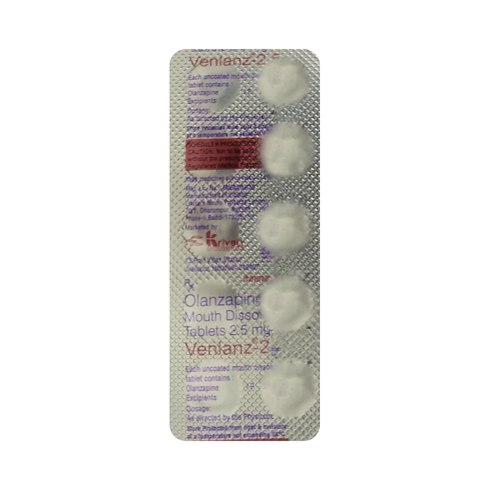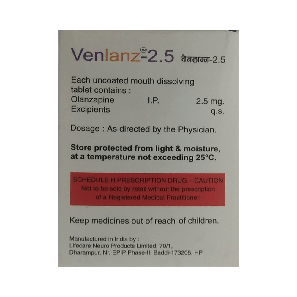 Venlanz 2.5 Tablet MD is used in the treatment of schizophrenia (a mental disorder that can result in hallucinations or delusions and also adversely affects a person’s ability to think and behave) and mania. Venlanz 2.5 Tablet MD may be taken with or without food. However, it is advised to take it at the same time each day as this helps to maintain a consistent level of medicine in the body. Take this medicine in the dose and duration as advised by your doctor and if you have missed a dose, take it as soon as you remember. This medication mustn't be stopped suddenly without talking to your doctor as it may worsen your symptoms.Some common side effects of this medicine include dryness in the mouth, constipation, muscle rigidity, and restlessness. Initially, this medicine may cause a sudden drop in blood pressure when you change positions, so it is better to rise slowly if you have been sitting or lying down. It also causes dizziness and sleepiness, so do not drive or do anything that requires mental focus until you know how this medicine affects you.However, this medicine may increase your weight, blood sugar, and cholesterol levels but, modifying your lifestyle by having a healthy diet and exercising regularly can reduce this side effect. You should be cautious as in rare cases it may cause serious side effects like very high blood sugar levels or seizures.
