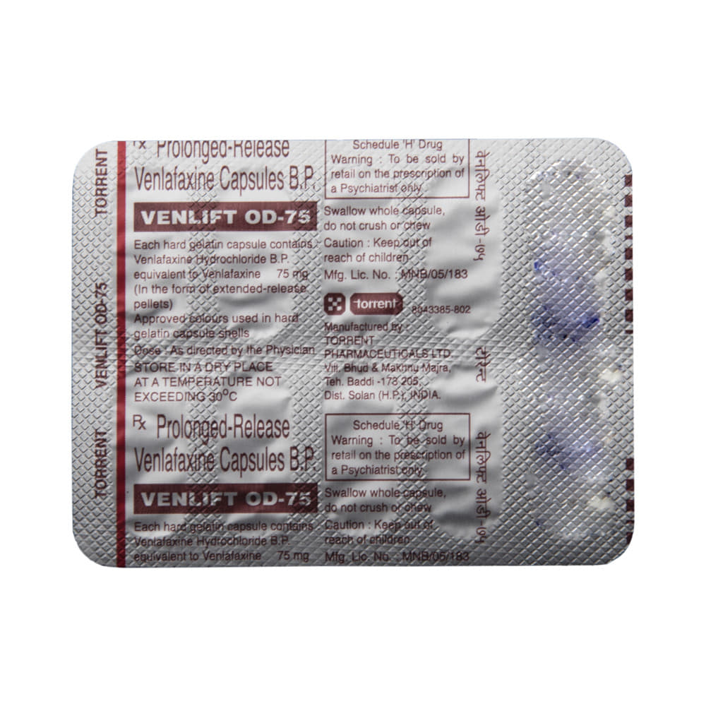 VenLIFT OD 75 Capsule PR is a medicine used to treat major depressive disorder and anxiety disorders. It helps improve mood, reduce nervousness, and improve overall well-being by restoring the balance of certain brain chemicals that affect mood and emotions. VenLIFT OD 75 Capsule PR should be taken with food. Take this medicine at the same time each day to maintain a stable level in your blood. If you miss a dose, take it as soon as you remember. Do not skip doses, and complete the full course of treatment even if you feel better. Do not stop taking this medication abruptly, as it may worsen your symptoms.Some common side effects of this medicine include nausea, insomnia (difficulty sleeping), constipation, increased sweating, and sexual dysfunction. However, these side effects are temporary and typically resolve on their own over time. Consult your doctor if these do not subside or bother you.VenLIFT OD 75 Capsule PR may cause dizziness and drowsiness, so avoid driving or engaging in activities that require mental focus until you understand how this medicine affects you. Before taking VenLIFT OD 75 Capsule PR, inform your doctor if you have any kidney, heart, or liver conditions or a history of seizures (epilepsy or fits). Additionally, notify your doctor if you experience any unusual mood or behavioral changes, worsening depression, or suicidal thoughts. Pregnant and breastfeeding women should consult before taking this medicine, as it may cause harmful effects on the developing baby.