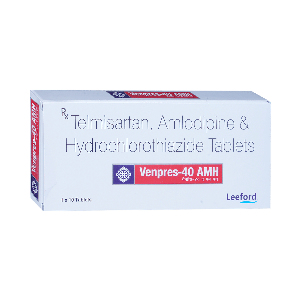 Venpres AMH 40mg/5mg/12.5mg Tablet is a combination of medicines used to treat hypertension (high blood pressure) when a single medication is not effective. It helps to lower high blood pressure thus reduces chances of future heart attack and stroke. Venpres AMH 40mg/5mg/12.5mg Tablet should be taken with or without food. The dose will depend on your condition and how you respond to the medicine. Try to take it at the same time each day. It is important to keep taking this medicine until your doctor tells you not to. It contains a diuretic (water pill) and will make you urinate more so, it is best to avoid taking this medicine within four hours of going to bed. Use this medicine regularly to get the most benefit from it even if you feel well. High blood pressure does not usually have symptoms and if you stop taking it your risk of heart attack or stroke may increase.The most common side effects of this medicine include headache, dizziness, tiredness, taste change, fatigue, flu-like symptoms, diarrhea, and sinusitis. Consult your doctor If any of these bother you, or get worse, or won't go away. Drink plenty of fluids while taking medicine to overcome muscle weakness, dry mouth, and extreme thirst.Before taking it, let your doctor know if you have any liver or kidney problems. Pregnant or breastfeeding women should also consult their doctor for advice before taking this medicine. You also need to tell your doctor what other medicines you are taking especially those used to treat high blood pressure or heart conditions. You should have your blood pressure, kidney function, level of electrolytes, and blood sugar level checked regularly to make sure that this medicine is working properly.