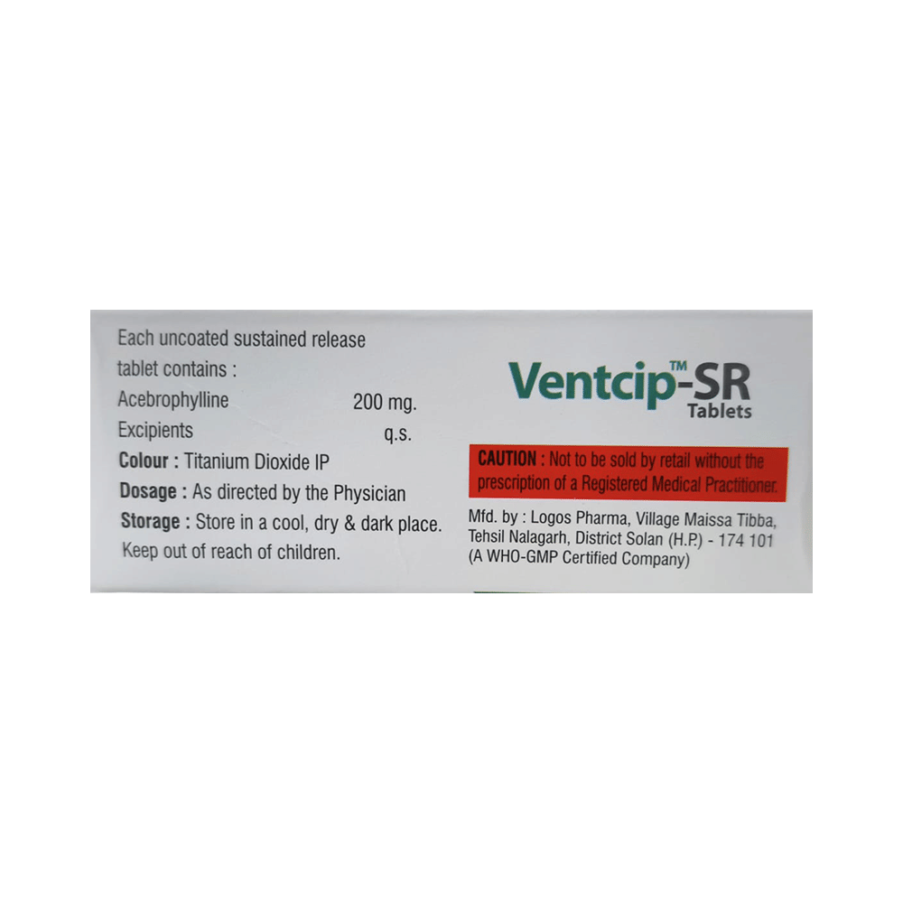 Ventcip-SR Tablet is used to treat and prevent symptoms of asthma, bronchitis, and chronic obstructive pulmonary disorder (a lung disorder in which airflow to the lung is blocked). It helps relax the muscles of the air passages, thus widening them and making them easier to breathe. Ventcip-SR Tablet can be taken with the food in the evening. Take it at the same time every day to get the most benefit. The dose and how often you take it depends on what you take it for. Your doctor will decide how much you need to improve your symptoms. Take this medicine for as long as it is prescribed for you. Do not miss even a single dose. If missed, take it as soon as you remember, or skip the missed dose and continue with regular dosing if it's almost time for the next dose. It does not work immediately or prevent the already-started breathing trouble; hence, always carry your medical inhaler for an emergency.The most common side effects of this medicine include abdominal discomfort, abdominal distension, vomiting, abdominal pain, diarrhea, constipation, and heartburn. If these bother you or appear serious, let your doctor know. There may be ways of reducing or preventing them. Generally, it is advised not to consume alcohol or do not smoke while on treatment.Before taking this medicine, tell your doctor if you have kidney, liver, or heart-related disease. Your doctor should also know about all other medicines you are taking, as many may make this medicine less effective or change its effect. Before starting the treatment, inform your doctor if you are pregnant or breastfeeding.