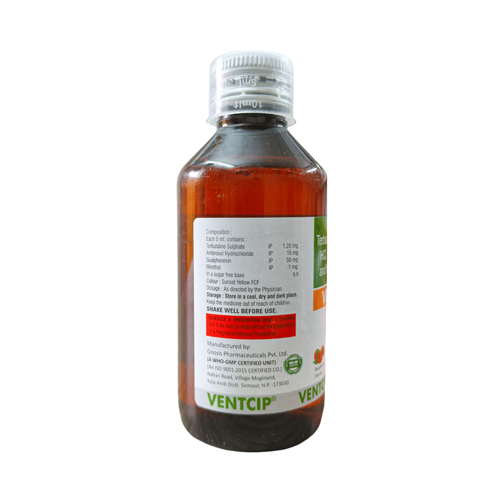 Ventcip Syrup Raspberry Sugar Free is a combination medicine used to treat cough. It thins the mucus in the nose and windpipe, making it easier to cough out. This medicine also relieves throat irritation and provides cooling sensation. Ventcip Syrup Raspberry Sugar Free is taken with or without food in a dose and duration as advised by the doctor. The dose you are given will depend on your condition and how you respond to the medicine. You should keep taking this medicine for as long as your doctor recommends. If you stop treatment too early your symptoms may come back and your condition may worsen. Let your doctor know about all other medications you are taking as some may affect, or be affected by this medicine.The most common side effects are nausea, diarrhea, vomiting, stomach discomfort, headache, rash, tremor, and increased heart rate. Most of these are temporary and usually resolve with time. Contact your doctor straight away if you are at all concerned about any of these side effects. This medicine can also cause sleepiness, so do not drive or do anything that requires mental focus until you know how this medicine affects you. Avoid drinking alcohol while taking this medicine as it can make sleepiness worse.Never support self-medication or recommend your medicine to another person. It is beneficial to have plenty of fluids while taking this medication. Before taking this medicine, you should tell your doctor if you are pregnant, planning pregnancy or breastfeeding.