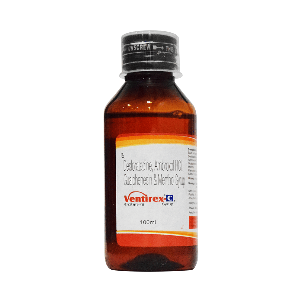 Ventirex-C Plus Syrup is a combination of four medicines: Ambroxol, Desloratadine, Guaifenesin and Menthol which relieve cough with mucus.