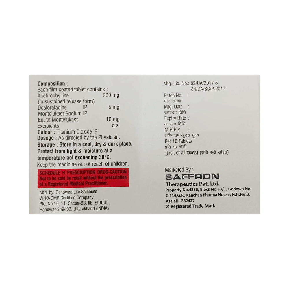 Salt Composition: Acebrophylline (200mg) + Desloratadine (5mg) + Montelukast (10mg)