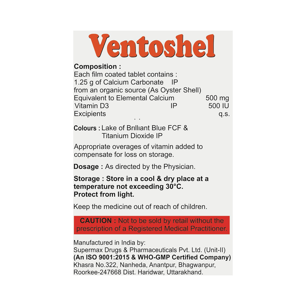 Ventoshel Tablet is a nutritional supplement used in the treatment of calcium deficiency. It is prescribed when your diet alone cannot provide the necessary calcium your body needs. It increases the absorption of calcium and helps prevent or treat low blood calcium levels. Ventoshel Tablet may be taken with or without food. Take it in the dose and duration advised by the doctor. Take it regularly at the same time each day to get maximum benefits from it. Do not take it more than or for longer than prescribed by the doctor, as that may cause harmful effects.There is limited data on the side effects of Ventoshel Tablet. Let your doctor know if you experience any symptoms while taking Ventoshel Tablet. They may be able to suggest ways to treat or manage the side effects.Before you start Ventoshel Tablet, let your doctor know if you have any medical conditions. Let your doctor also know about all the medications you are taking, as some medicines may interact with Ventoshel Tablet. Pregnant or breastfeeding women should consult their doctor before taking Ventoshel Tablet to ensure safety.