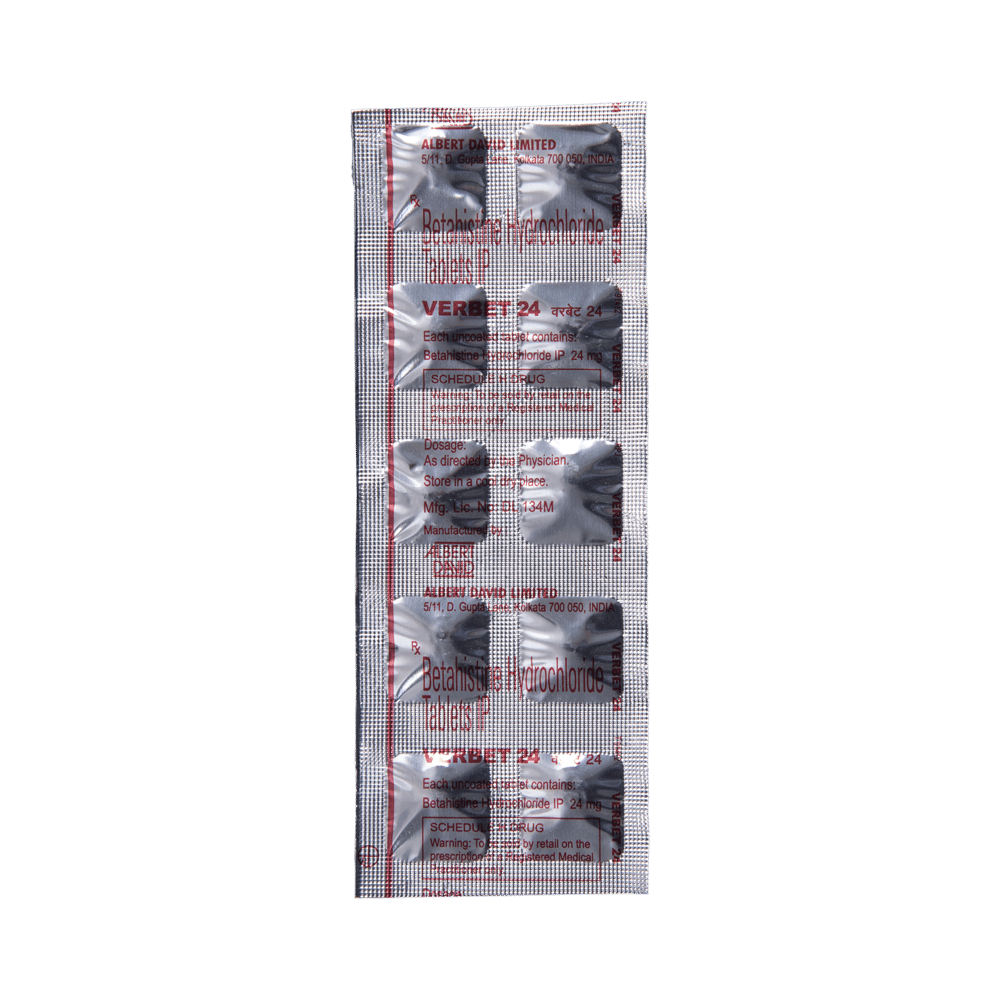 Verbet 24 Tablet is a histamine analog. It works by improving the blood flow in the inner ear which reduces the pressure of excess fluid there. Excess fluid can send signals to the brain causing nausea, dizziness or spinning sensations (symptoms of Ménière's disease). Verbet 24 Tablet additionally dampens down the nerve signals sent from the inner ear to the brain relieving the symptoms of Ménière's disease.