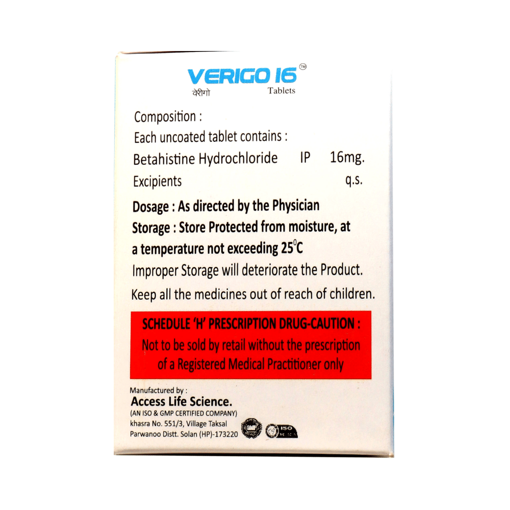 Verigo 16 Tablet is used to prevent and treat a disorder of the inner ear known as Ménière’s disease. The symptoms include dizziness (vertigo), ringing in the ears (tinnitus), and loss of hearing, probably caused by fluid in the ear. This medicine helps relieve the symptoms by reducing the amount of fluid. Verigo 16 Tablet should be swallowed whole with water and taken at the same time(s) each day to get the most benefit. Your doctor will decide what is the correct dose to relieve your symptoms and how often you need to take it. You may need to take this medicine for several months and you should take it for as long as prescribed by your doctor, even if you start feeling better. The most common side effects include headache, feeling sick, and indigestion (dyspepsia). You may also get stomach pain and bloating. Taking the medicine with food can help reduce stomach problems. Before taking this medicine, you should talk to your doctor if you have a stomach ulcer, asthma, or high or low blood pressure. You must also tell him/her what other medicines you are taking, to make sure you are safe. Also speak to your doctor if you are pregnant, trying to become pregnant, or breastfeeding.