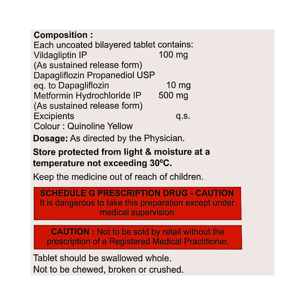Salt Composition: Dapagliflozin (10mg) + Metformin (500mg) + Vildagliptin (100mg)