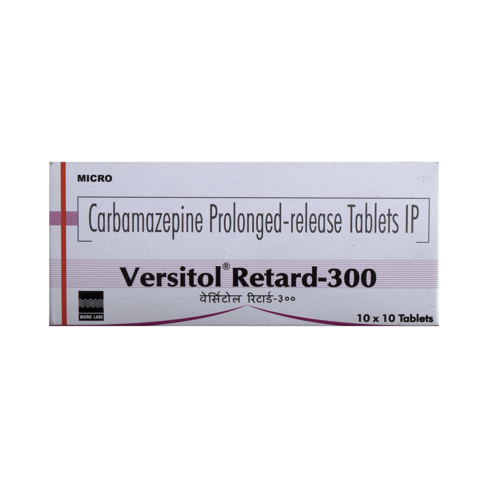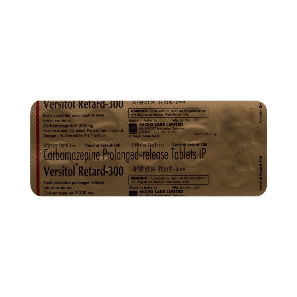 Versitol Retard 300 Tablet PR is an anti-epileptic medicine used to treat epilepsy. It helps prevent certain types of seizures (fits). It is also prescribed for a painful condition of the face, head, and neck known as trigeminal neuralgia and diabetes-related nerve pain (diabetic neuropathy). Versitol Retard 300 Tablet PR must be taken with or without food, but take it at the same time every day. The dose and how often you need to take it will be decided by your doctor so that you get the right amount to control your symptoms. It may be increased gradually. Many other medicines can interfere with this medicine so tell your doctor about all the medicines you are taking to make sure it is safe.You can take this medicine with or without food but take it regularly at the same time each day to get the maximum benefit. It is important to take this medicine for as long as you are advised, even if you feel well. Missing even a single dose may trigger a seizure and, if you stop taking it abruptly, your condition may get worse.The most common side effects of this medicine include nausea, vomiting, feeling dizzy, tired or drowsy, unsteadiness (balance disorder), constipation, dry mouth, and itching. Some people may develop blurring of vision and slurred speech. Most of the side effects are not serious. However, let your doctor know straight away if you notice a skin rash or if your mood becomes depressed or if you develop any thoughts about harming yourself. Before taking Versitol Retard 300 Tablet PR, tell your doctor if you have any heart problems, kidney or liver disease, difficulty in urinating, or any mental illness like depression. These conditions may affect your treatment. You may be advised some blood tests (eg. CBC) before starting treatment and then periodically thereafter, to monitor your progress.