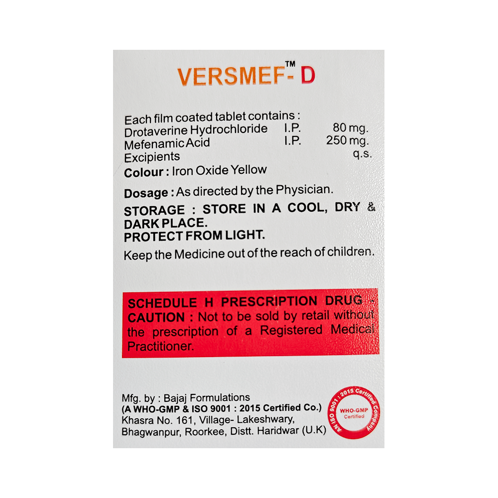 Versmef-D Tablet is a combination of two medicines: Drotaverine and Mefenamic Acid, which relieves abdominal pain and cramps. Drotaverine is an anti-spasmodic medicine which relieves contractions (spasms) associated with smooth muscles in the abdomen. Mefenamic Acid is a non-steroidal anti-inflammatory drug (NSAID). It works by blocking the release of certain chemical messengers that cause abdominal pain and inflammation (swelling).