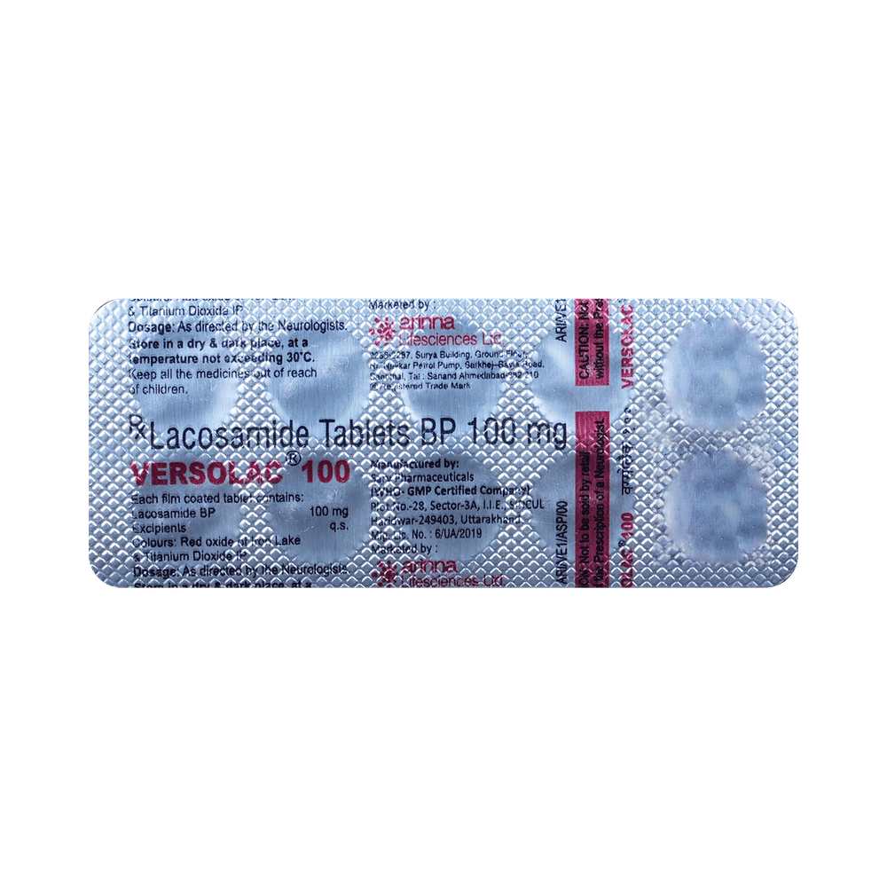 Versolac 100 Tablet is an antiepileptic medication. It slowly inactivates the sodium gated channels, which decreases the abnormal and excessive activity of the nerve cells in the brain. Thereby, it controls seizures or fits.