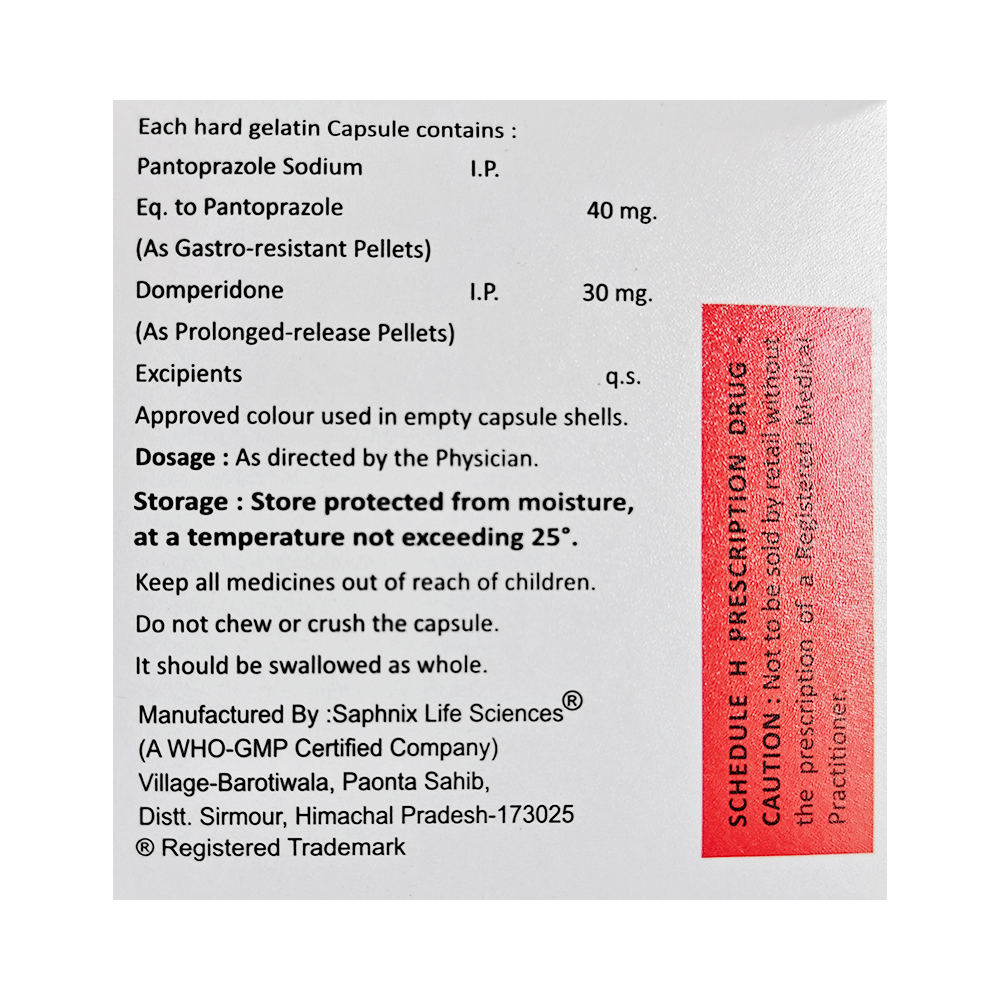 Salt Composition: Domperidone (30mg) + Pantoprazole (40mg)