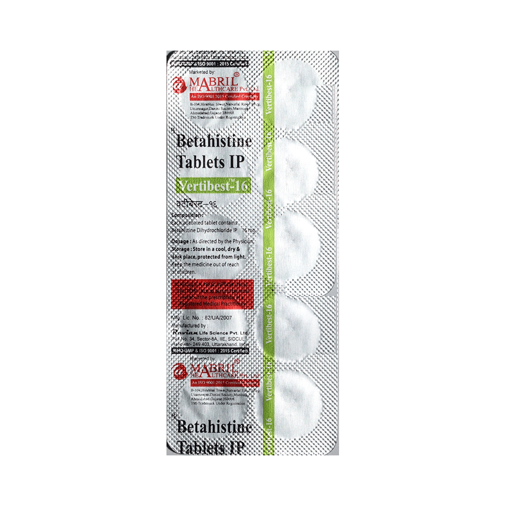 Vertibest 16 Tablet is a histamine analog. It works by improving the blood flow in the inner ear which reduces the pressure of excess fluid there. Excess fluid can send signals to the brain causing nausea, dizziness or spinning sensations (symptoms of Ménière's disease). Vertibest 16 Tablet additionally dampens down the nerve signals sent from the inner ear to the brain relieving the symptoms of Ménière's disease.