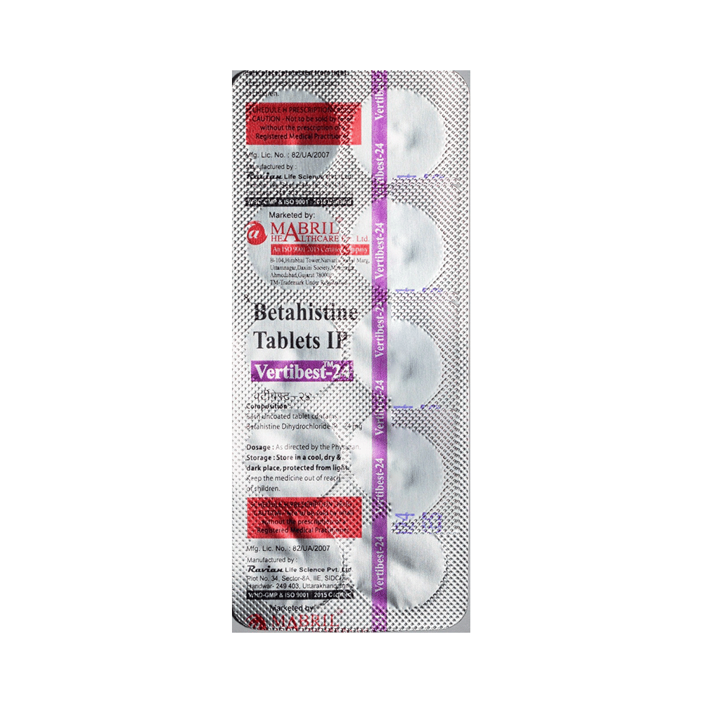 Vertibest 24 Tablet is used to prevent and treat a disorder of the inner ear known as Ménière’s disease. The symptoms include dizziness (vertigo), ringing in the ears (tinnitus), and loss of hearing, probably caused by fluid in the ear. This medicine helps relieve the symptoms by reducing the amount of fluid. Vertibest 24 Tablet should be swallowed whole with water and taken at the same time(s) each day to get the most benefit. Your doctor will decide what is the correct dose to relieve your symptoms and how often you need to take it. You may need to take this medicine for several months and you should take it for as long as prescribed by your doctor, even if you start feeling better. The most common side effects include headache, feeling sick, and indigestion (dyspepsia). You may also get stomach pain and bloating. Taking the medicine with food can help reduce stomach problems. Before taking this medicine, you should talk to your doctor if you have a stomach ulcer, asthma, or high or low blood pressure. You must also tell him/her what other medicines you are taking, to make sure you are safe. Also speak to your doctor if you are pregnant, trying to become pregnant, or breastfeeding.