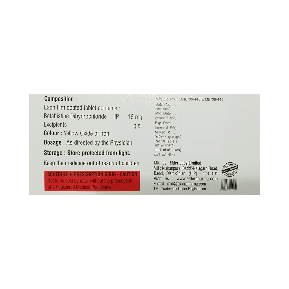 Vertider 16 Tablet is used to prevent and treat a disorder of the inner ear known as Ménière’s disease. The symptoms include dizziness (vertigo), ringing in the ears (tinnitus), and loss of hearing, probably caused by fluid in the ear. This medicine helps relieve the symptoms by reducing the amount of fluid. Vertider 16 Tablet should be swallowed whole with water and taken at the same time(s) each day to get the most benefit. Your doctor will decide what is the correct dose to relieve your symptoms and how often you need to take it. You may need to take this medicine for several months and you should take it for as long as prescribed by your doctor, even if you start feeling better. The most common side effects include headache, feeling sick, and indigestion (dyspepsia). You may also get stomach pain and bloating. Taking the medicine with food can help reduce stomach problems. Before taking this medicine, you should talk to your doctor if you have a stomach ulcer, asthma, or high or low blood pressure. You must also tell him/her what other medicines you are taking, to make sure you are safe. Also speak to your doctor if you are pregnant, trying to become pregnant, or breastfeeding.