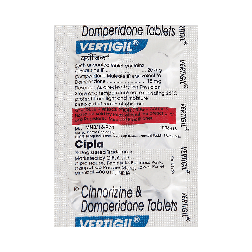 Vertigil 10 mg/20 mg Tablet is a combination of two medicines: Domperidone and Cinnarizine.