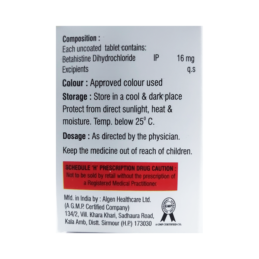 Vertika 16 Tablet is used to prevent and treat a disorder of the inner ear known as Ménière’s disease. The symptoms include dizziness (vertigo), ringing in the ears (tinnitus), and loss of hearing, probably caused by fluid in the ear. This medicine helps relieve the symptoms by reducing the amount of fluid. Vertika 16 Tablet should be swallowed whole with water and taken at the same time(s) each day to get the most benefit. Your doctor will decide what is the correct dose to relieve your symptoms and how often you need to take it. You may need to take this medicine for several months and you should take it for as long as prescribed by your doctor, even if you start feeling better. The most common side effects include headache, feeling sick, and indigestion (dyspepsia). You may also get stomach pain and bloating. Taking the medicine with food can help reduce stomach problems. Before taking this medicine, you should talk to your doctor if you have a stomach ulcer, asthma, or high or low blood pressure. You must also tell him/her what other medicines you are taking, to make sure you are safe. Also speak to your doctor if you are pregnant, trying to become pregnant, or breastfeeding.