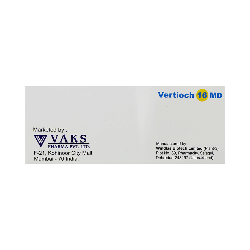 Vertioch 16 MD Tablet is used to prevent and treat a disorder of the inner ear known as Ménière’s disease. The symptoms include dizziness (vertigo), ringing in the ears (tinnitus), and loss of hearing, probably caused by fluid in the ear. This medicine helps relieve the symptoms by reducing the amount of fluid. Vertioch 16 MD Tablet should be swallowed whole with water and taken at the same time(s) each day to get the most benefit. Your doctor will decide what is the correct dose to relieve your symptoms and how often you need to take it. You may need to take this medicine for several months and you should take it for as long as prescribed by your doctor, even if you start feeling better. The most common side effects include headache, feeling sick, and indigestion (dyspepsia). You may also get stomach pain and bloating. Taking the medicine with food can help reduce stomach problems. Before taking this medicine, you should talk to your doctor if you have a stomach ulcer, asthma, or high or low blood pressure. You must also tell him/her what other medicines you are taking, to make sure you are safe. Also speak to your doctor if you are pregnant, trying to become pregnant, or breastfeeding.