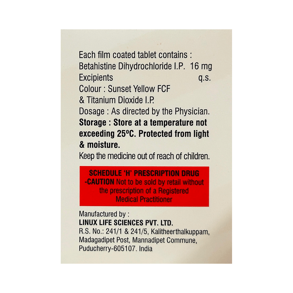 Vertirest 16 Tablet is used to prevent and treat a disorder of the inner ear known as Ménière’s disease. The symptoms include dizziness (vertigo), ringing in the ears (tinnitus), and loss of hearing, probably caused by fluid in the ear. This medicine helps relieve the symptoms by reducing the amount of fluid. Vertirest 16 Tablet should be swallowed whole with water and taken at the same time(s) each day to get the most benefit. Your doctor will decide what is the correct dose to relieve your symptoms and how often you need to take it. You may need to take this medicine for several months and you should take it for as long as prescribed by your doctor, even if you start feeling better. The most common side effects include headache, feeling sick, and indigestion (dyspepsia). You may also get stomach pain and bloating. Taking the medicine with food can help reduce stomach problems. Before taking this medicine, you should talk to your doctor if you have a stomach ulcer, asthma, or high or low blood pressure. You must also tell him/her what other medicines you are taking, to make sure you are safe. Also speak to your doctor if you are pregnant, trying to become pregnant, or breastfeeding.