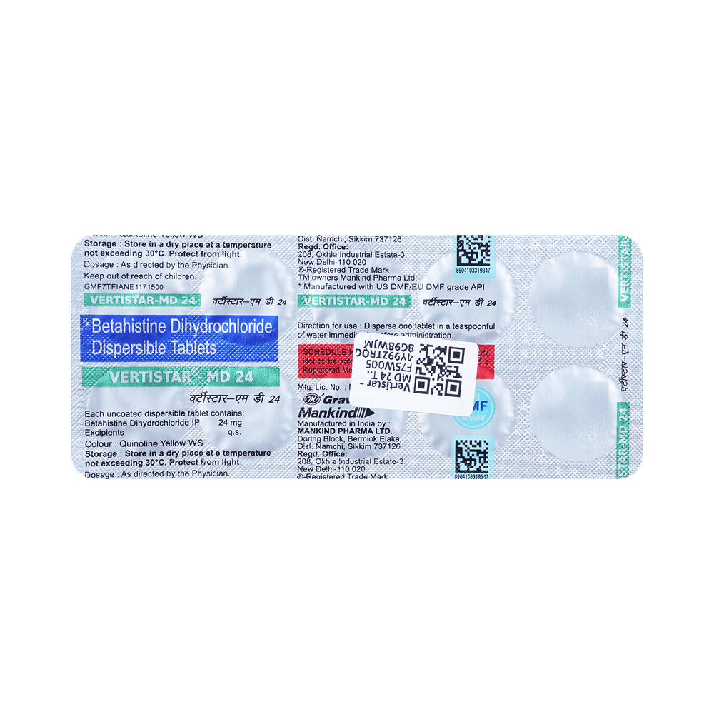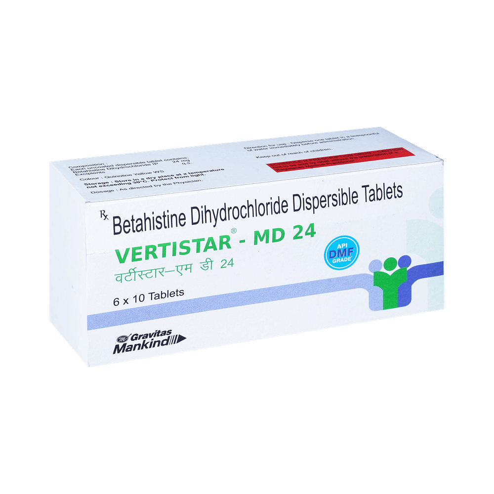 You have been prescribed Vertistar -MD 24 Tablet to relieve vertigo (dizziness), hearing problems and tinnitus (noise in the ear) associated with Ménière's disease.