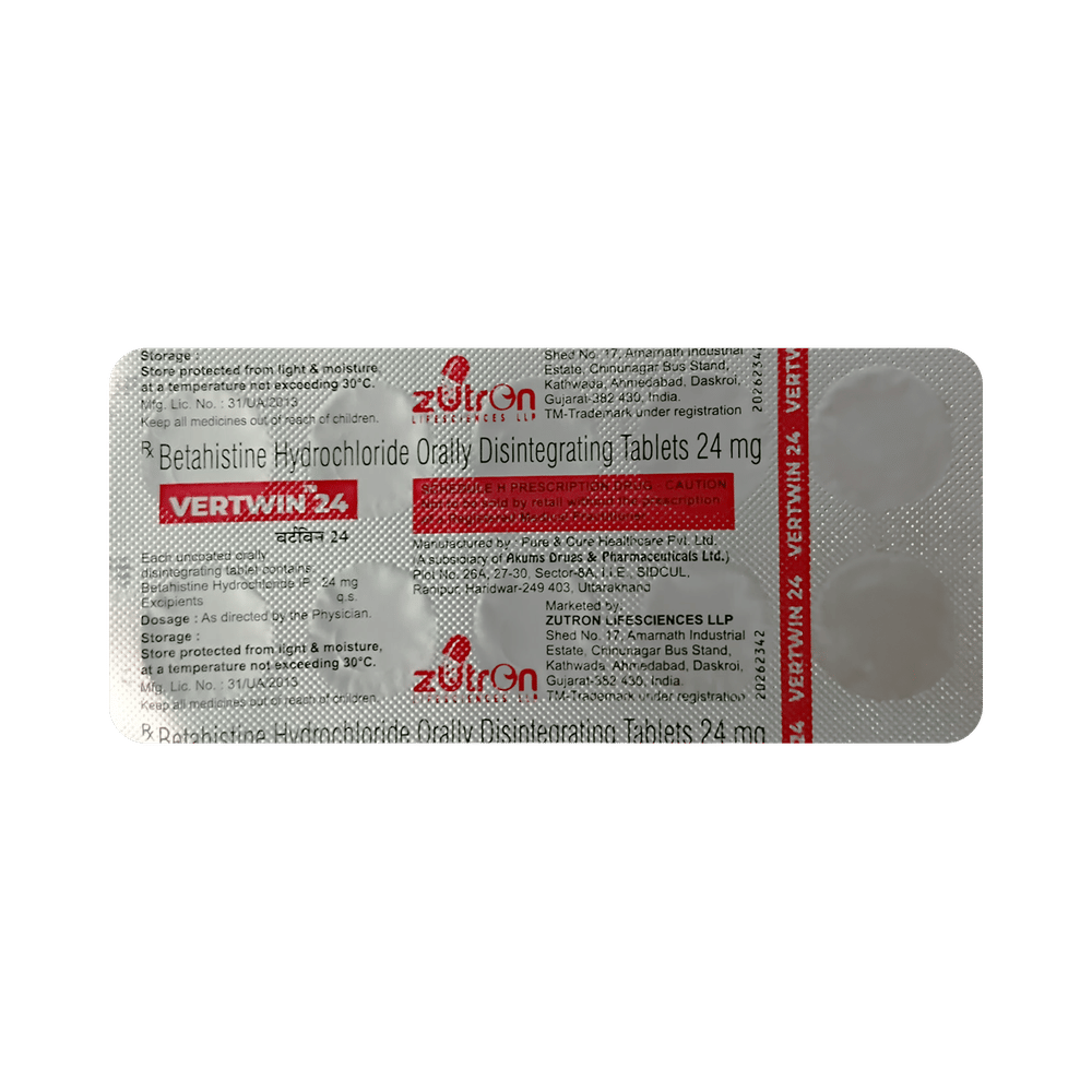 You have been prescribed Vertwin 24 Tablet MD to relieve vertigo (dizziness), hearing problems and tinnitus (noise in the ear) associated with Ménière's disease.
