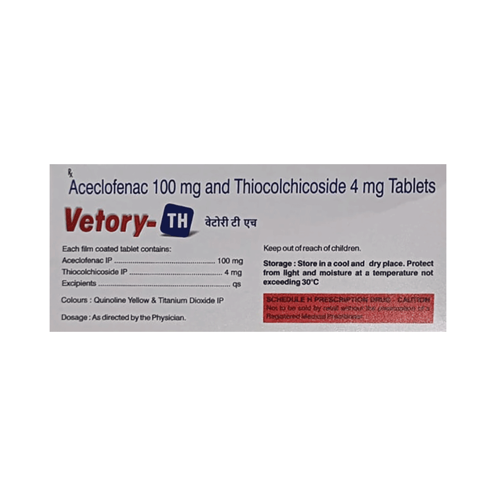 In Treatment of inflammatory conditions associated with Muscle spasmVetory-TH Tablet is a combination medicine that contains a painkiller as well as a muscle relaxant. It is used to relieve pain, inflammation, and swelling in conditions that affect muscles. Also, it effectively relieves muscle stiffness or spasm, thereby improving muscle movement. It works by blocking chemical messengers in the brain that tell us we have pain.Take it as it is prescribed to get the most benefit. Do not take more or for a longer duration than needed as that can be dangerous. In general, you should take the lowest dose that works, for the shortest possible time. This will help you to go about your daily activities more easily and have a better, more active, quality of life.In Treatment of Pain due to muscle spasmVetory-TH Tablet is a combination medicine that contains a painkiller as well as a muscle relaxant. It is used to relieve pain, inflammation, and swelling in conditions that affect muscles. Also, it effectively relieves muscle stiffness or spasm, thereby improving muscle movement. It works by blocking chemical messengers in the brain that tell us we have pain.Take it as it is prescribed to get the most benefit. Do not take more or for a longer duration than needed as that can be dangerous. In general, you should take the lowest dose that works, for the shortest possible time. This will help you to go about your daily activities more easily and have a better, more active, quality of life.show moreshow less