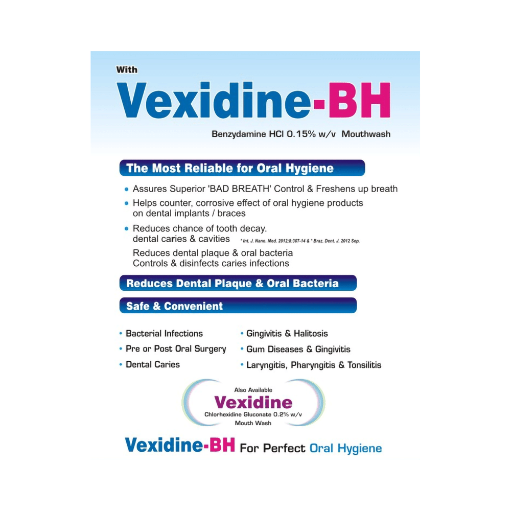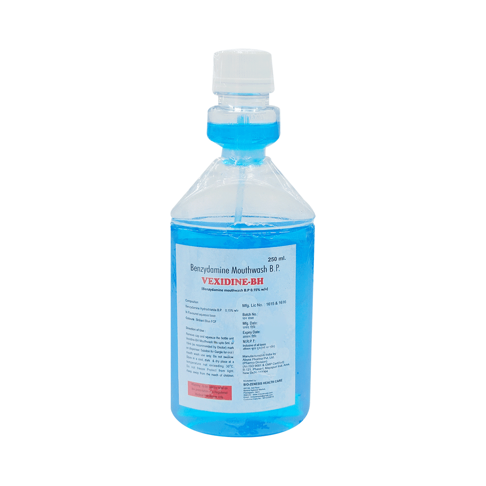 Vexidine-BH Mouth Wash is a pain relieving medicine. It is used to relieve pain, discomfort, and inflammation of the mouth, gums, and throat. It provides relief from pain and swelling and aids in speeding up the healing process. Vexidine-BH Mouth Wash should be used strictly as advised by your doctor. Use it in the dose and duration as directed by your doctor. You should not use more medicine or apply it more often than prescribed by your doctor. This will not make it work any faster and may increase side effects.It is usually safe with little or no side effects. However, it may cause burning sensation and skin irritation at the site of application in some people. These are usually temporary and resolve with time. If they do not get better with time or worsen, you should let your doctor know. Your doctor may be able to suggest ways of preventing or reducing the symptoms.Before using the medicine, it is important to tell your doctor if you are using or have recently used any other medicines for the same condition or other diseases. To make sure the medicine is safe, pregnant and breastfeeding women should consult their doctor before using the medicine.
