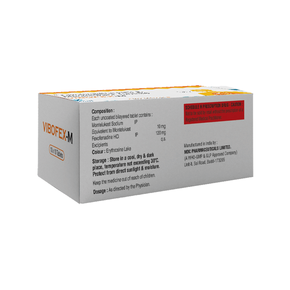 Vibofex-M Tablet is a combination medicine used in the treatment of allergy symptoms such as runny nose, stuffy nose, sneezing, watery eyes, and congestion or stuffiness. Vibofex-M Tablet is taken with or without food in a dose and duration as advised by the doctor. The dose you are given will depend on your condition and how you respond to the medicine. You should keep taking this medicine for as long as your doctor recommends. If you stop treatment too early your symptoms may come back and your condition may worsen. Let your healthcare team know about all other medications you are taking as some may affect, or be affected by this medicine.The most common side effects include nausea, diarrhea, vomiting, skin rash, flu-like symptoms, and headache. Most of these are temporary and usually resolve with time. Contact your doctor straight away if you are at all concerned about any of these side effects. This medicine may cause dizziness and sleepiness, so do not drive or do anything that requires mental focus until you know how this medicine affects you. Avoid drinking alcohol while taking this medicine as it can worsen your sleepiness.Never support self-medication or recommend your medicine to another person. It is beneficial to have plenty of fluids while taking this medication. Before you start taking this medicine it is important to inform your doctor if you are suffering from liver or kidney disease. You should also tell your doctor if you are pregnant, planning pregnancy or breastfeeding.