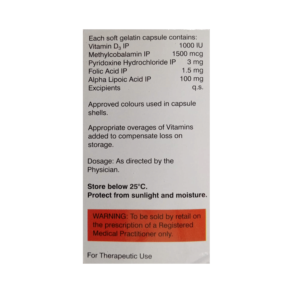 Salt Composition: Methylcobalamin (1500mcg) + Alpha Lipoic Acid (100mg) + Vitamin B6 (Pyridoxine) (3mg) + Folic Acid (1.5mg) + Vitamin D3 (1000IU)